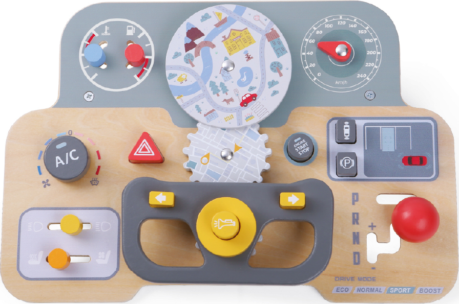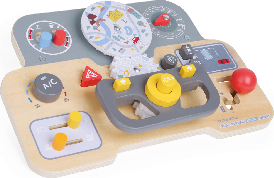 Mami, tati, dneska řídím já! Tato hrací deska přináší spoustu zábavy, díky které bude moci Vaše dítě rozvíjet svou zručnost, zvídavost a zejména jemnou motoriku. Interaktivní prvky jako jsou tlačítka či otočná kolečka dávají dítěti možnost procvičovat různé posouvání, otáčení či cvakání a připravit se tak na každodenní úkony. Mimo aktivit zapojující smyslové dovednosti deska disponuje volantem - skvělá možnost jak posunout představivou hru ještě dál. A navíc si mohou i zatroubit na cestu. Jízda to bude daleká!