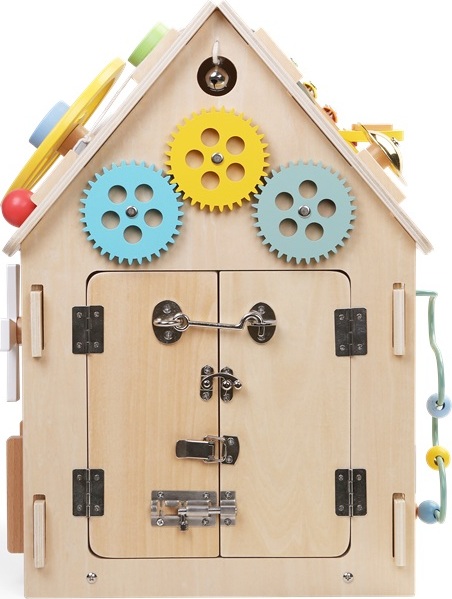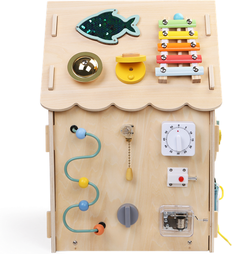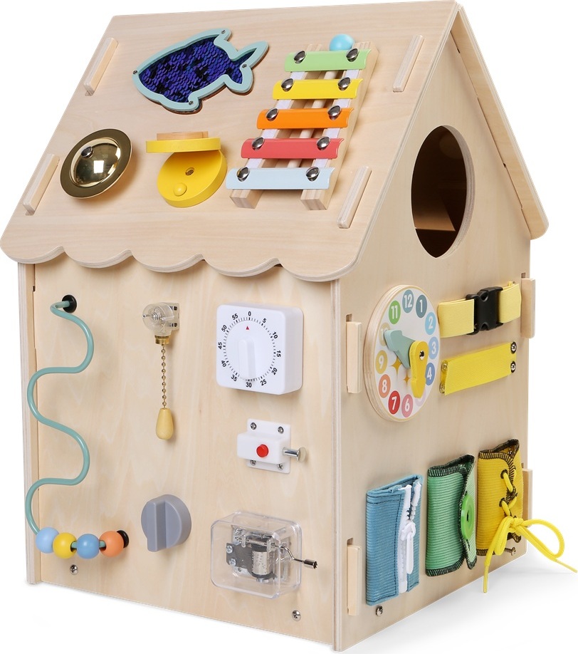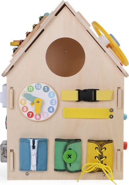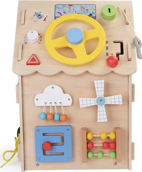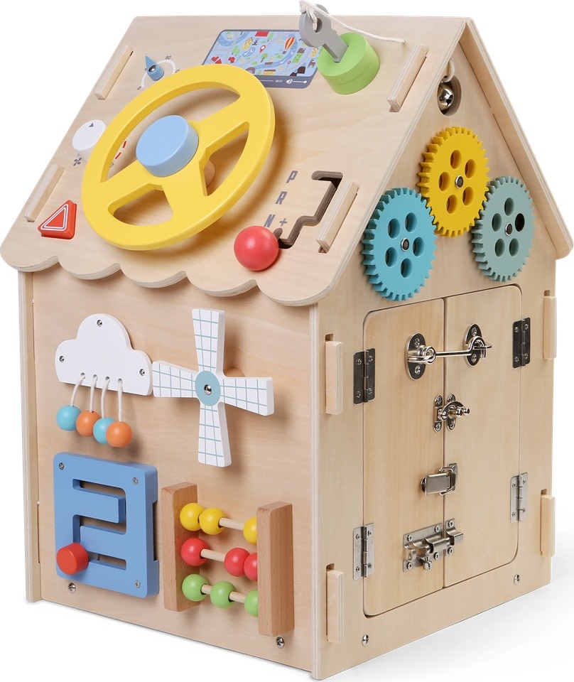 Objevte svět zábavy a učení s dřevěným domečkem se spoustou aktivit! Každá strana nabízí množství interaktivních prvků, které děti zabaví a zároveň podpoří rozvoj jemné motoriky, logického myšlení i smyslového vnímání. Děti mohou otáčet barevným volantem, zkoušet řadicí páku, vést kuličku labyrintem, točit ozubenými kolečky a sledovat, jak do sebe zapadají. Domeček nabízí také počítadlo, otáčecí větrník a závěsná korálková oblaka, které rozvíjejí smyslové vnímání i jemnou motoriku. Nechybí ani trénink praktických dovedností! Děti si mohou zkoušet otevírání a zavírání různých typů zámků, závor a západek, učí se zavázat tkaničky, zapnout zip či knoflík. Procvičují si trpělivost, přesnost i logické myšlení a připravují se tak zábavným způsobem na úkony každodenního života. Domeček je vyroben z kvalitního přírodního dřeva a natřen netoxickými barvami. Všechny hrany jsou hladké a bezpečné pro dětské ruce. Skvělý dárek pro zvídavé děti od 3 let. Hračka podporuje samostatnost, kreativitu a přirozenou touhu objevovat svět kolem sebe.