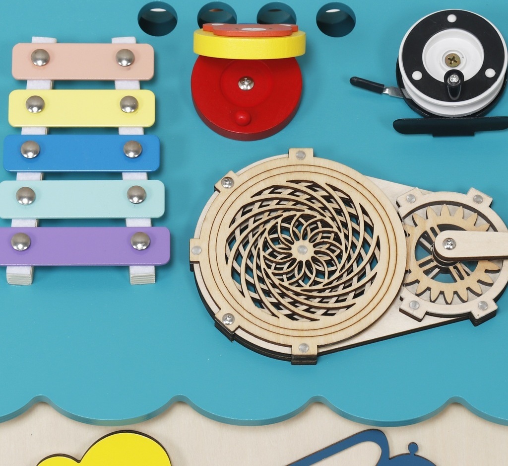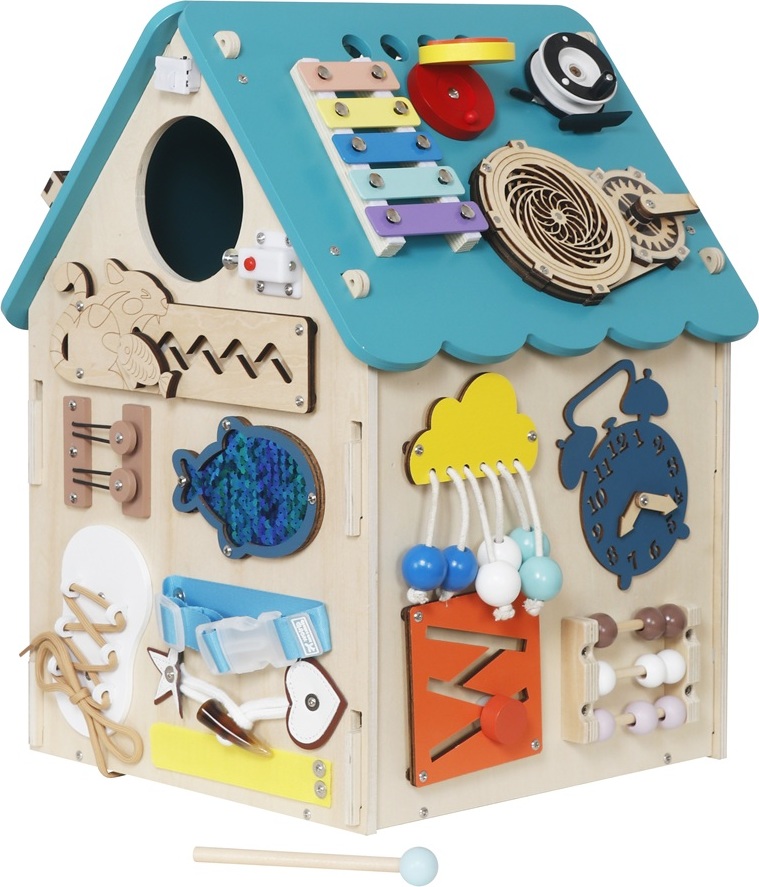 Od tkaniček až po hrající telefon! Tento nádherný interaktivní domeček je inspirovaný principy Montessori a přináší dětem nekonečné možnosti objevování a učení se hrou. Každá jeho strana nabízí nové dobrodružství, které rozvíjí jemnou motoriku, trpělivost, zvídavost a schopnost řešit problémy. Děti zde najdou různé druhy zámků, západek a háčků, které po odemknutí odhalí tajemná dvířka, spinner k roztočení, otočnou minutku, funkční vypínač se světýlkem, či barevný labyrint s rybičkou. Xylofon s paličkou seznámí děti s prvními tóny a rytmem, zatímco hodiny naučí porozumět času. Nechybí ani hrajicí telefon jenž Vás zabaví nejrůznějšími zvuky i veselými melodiemi! Domeček uvnitř svítí. Motivuje děti k samostatnému objevování, učí je trpělivosti a koncentraci a zároveň je připravuje na každodenní činnosti běžného života prostřednictvím praktického tréninku. Poskytuje bezpečné a podnětné prostředí, ve kterém si děti hravou formou rozvíjejí dovednosti nezbytné pro samostatnost. Kombinace přírodního dřeva s příjemnými barvami spolu s kvalitním provedením dělají z této hračky pěkný doplněk každého pokojíčku nebo herny. Domeček se dodává složený v krabici.