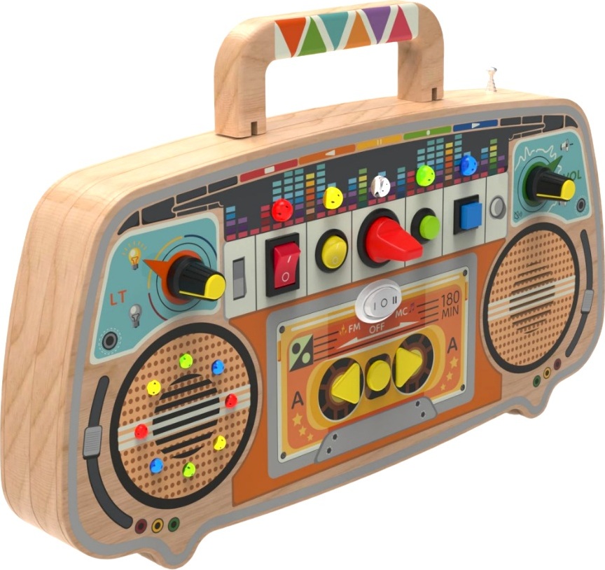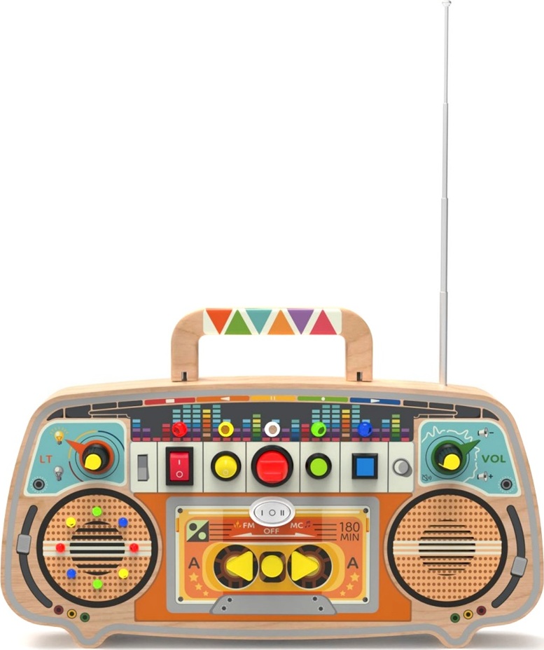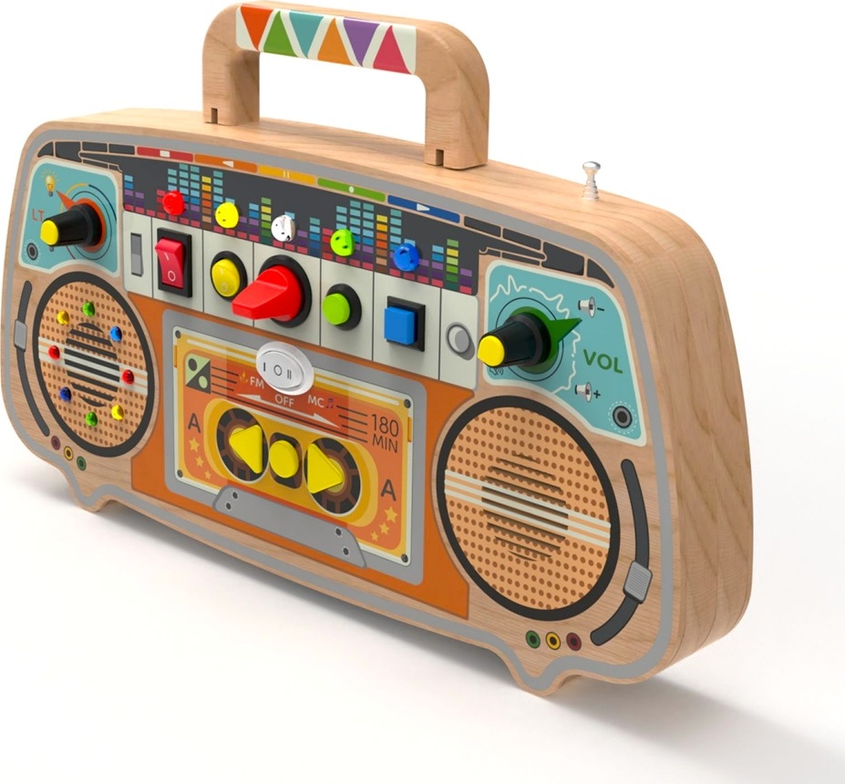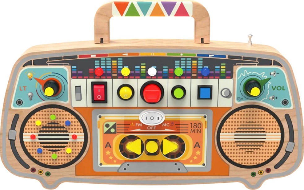 Objevte svět hudby, zvuků a zábavy s interaktivním FM rádiem, které funguje jako skutečné rádio! Tento originální dřevěný activity board ve stylu retro rádia okamžitě upoutá pozornost nejmenších dětí díky senzorickému LED panelu s barevnými světýlky a svítícími tlačítky. Chytře navržená kombinace interaktivních prvků, jako jsou otočné knoflíky, přepínače, posuvníky, stylizované reproduktory, podporuje rozvoj jemné motoriky, smyslového vnímání, kreativity a hudebního sluchu. A navíc si děti mohou naladit opravdové stanice a poslouchat hudbu či mluvené slovo! Také se zaposlouchají do nahraných příjemných melodií, díky nimž se seznámí s různými rytmy a hudebními styly. Praktické dřevěné madlo usnadňuje manipulaci a přenášení hračky. Díky veselému designu, funkčnímu provedení a kvalitnímu zpracování je FM rádio nejen poutavým doplňkem dětského pokoje, ale také skvělým dárkem pro malé muzikanty a zvídavé děti.