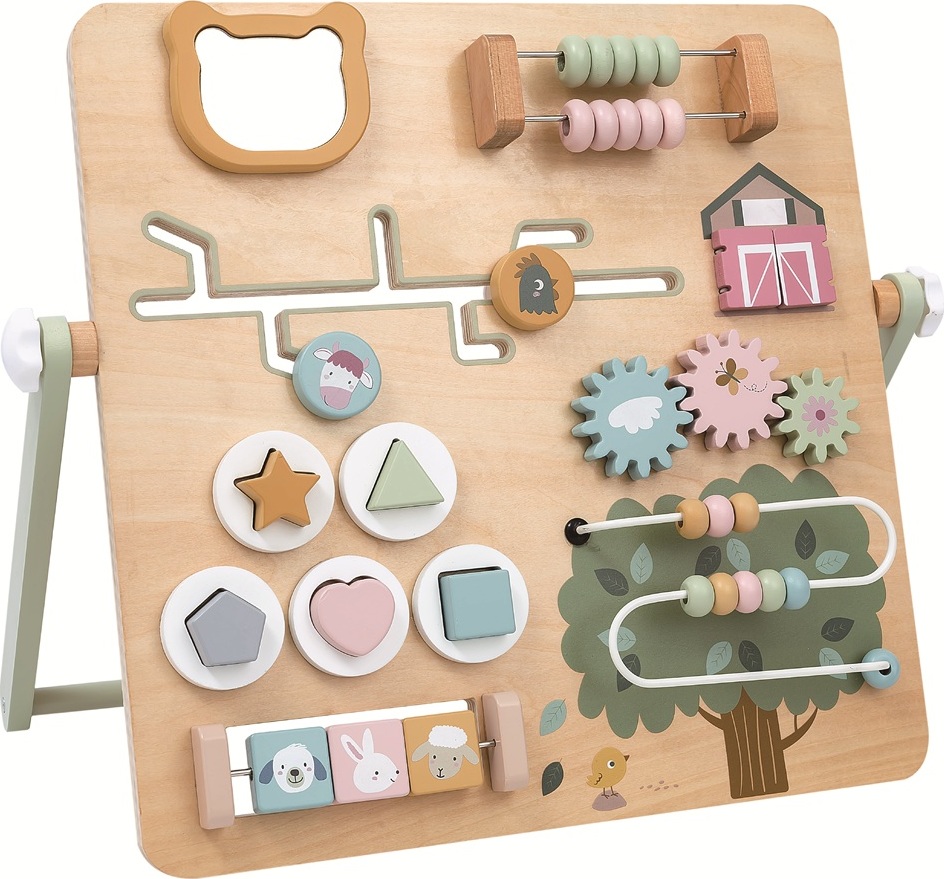 Objevte rozmanitý svět farmy prostřednictvím originální motorické desky plné aktivit, která děti nejen zabaví, ale rozvíjí také jejich motorické dovednosti, soustředění a logické myšlení. Dřevěná hrací deska nabízí pestrou škálu interaktivních prvků, jako jsou otočná ozubená kolečka, posuvný a korálkový labyrint či vkládací tvary, a motivují děti ke zkoumání, učení i hraní. Barevné provedení, přehledné uspořádání a kvalitní zpracování dělají z této hračky ideální vzdělávací pomůcku pro malé objevitele doma i ve školce. Motorická deska je opatřena praktickou stabilní opěrkou.