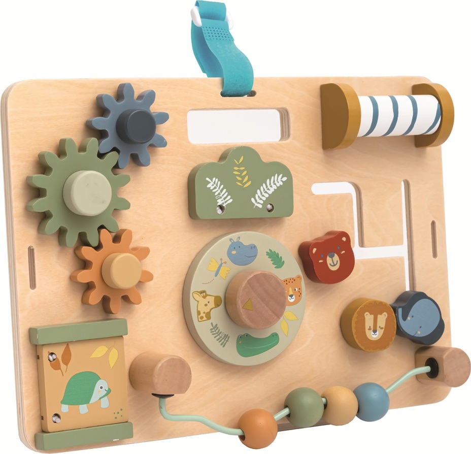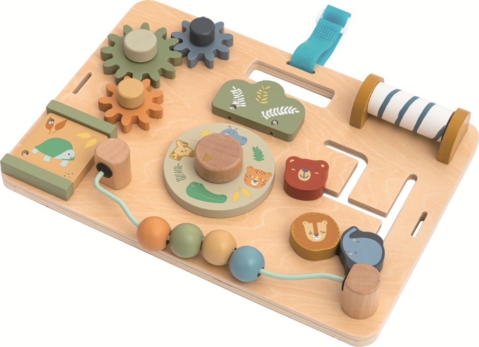 Tato hrací deska v pastelových barvách s roztomilými zvířátky přináší spoustu zábavy, díky které bude moci Vaše dítě rozvíjet zručnost, zvídavost a jemnou motoriku. Různé aktivity jako je korálkový labyrint, ozubená kolečka, otáčecí a posuvné destičky s obrázky zvířátek a další dávají dítěti možnost procvičovat otáčení, otevírání či zavírání a připravit se tak na úkony každodenního života. Jemné barvy, roztomilé obrázky a spousta aktivit stimulují smyslové vnímaní dětí. Díky praktickému výřezu lze desku jednoduše přenášet. Látkový popruh slouží k zavěšení.