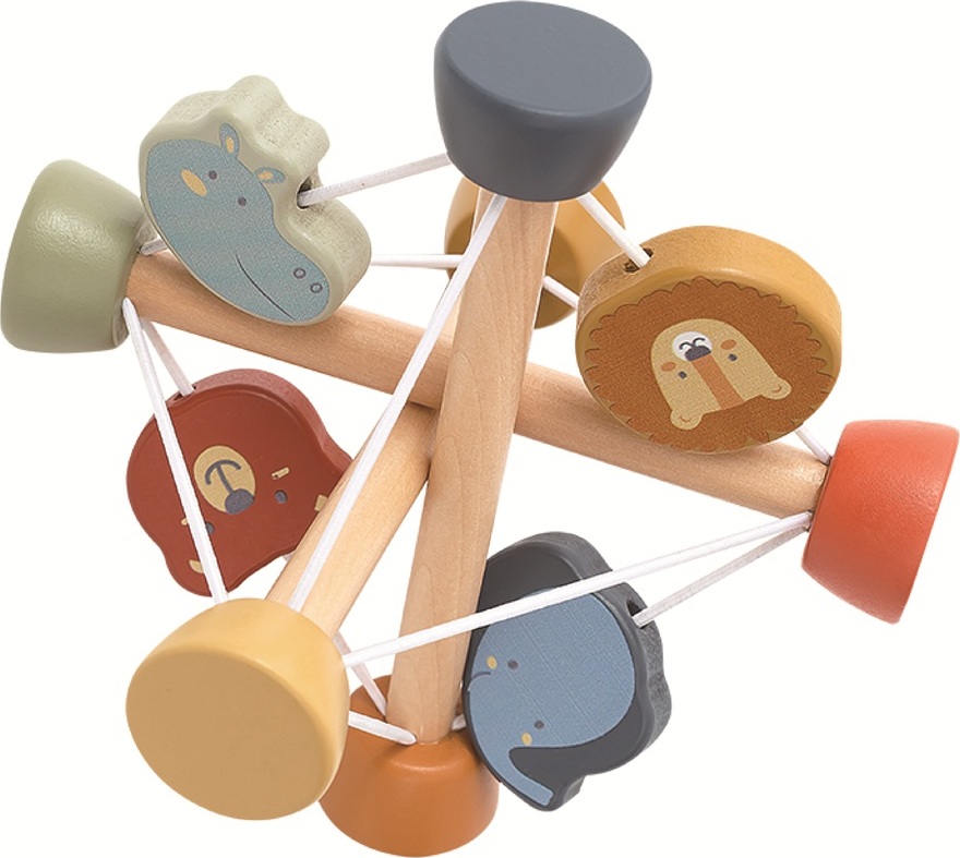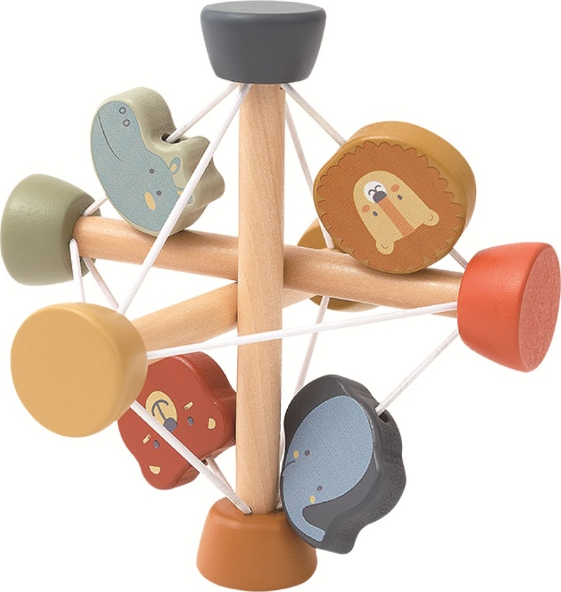 Aktivní koule je inovativní dřevěná hračka navržená pro nejmenší děti už od 10 měsíců. Pomáhá rozvíjet jemnou motoriku, koordinaci ruka-oko i dětskou zvídavost. K dřevěným kolíčkům jsou připevněny gumičky a na nich navlečena roztomilá zvířátka – lev, slon, hroch a medvěd, kterými mohou děti otáčet, tahat za ně a posouvat je. Kolíky lze snadno stlačovat nebo roztahovat, což dítěti umožňuje zkoumat různé možnosti a reakce na vlastní podněty. Hračka rozvíjí smyslové vnímání a koordinaci pohybů, podporuje rozpoznávání tvarů a barev, rozvíjí představivost a pomáhá dětem řešit jednoduché problémy při hře.
