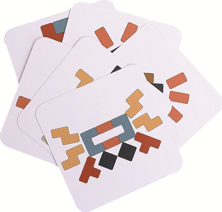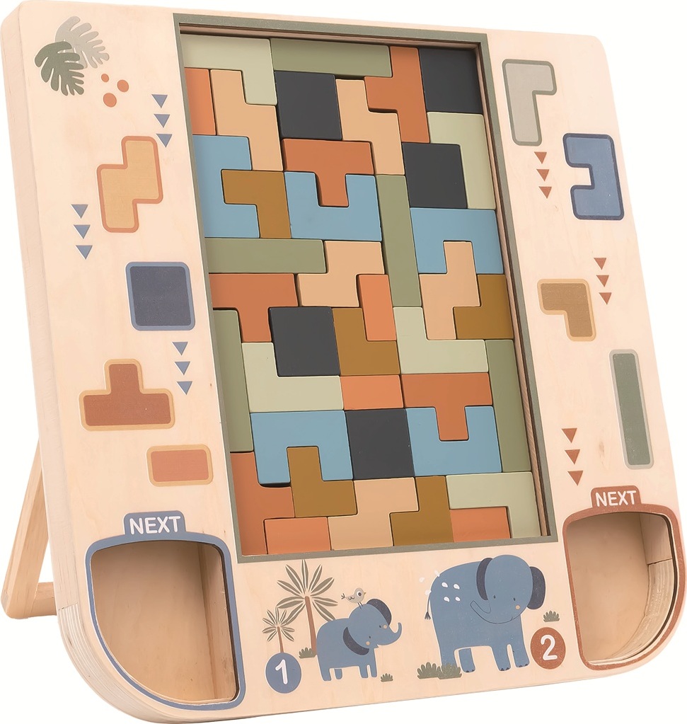 Chytrá a zábavná hra z přírodního dřeva, která rozvíjí logické myšlení, trpělivost i prostorovou představivost! Barevná skládačka nabízí více herních možností. Děti si mohou hrát samostatně nebo ve dvou. Při hře jednoho hráče je úkolem zaplnit celou hrací plochu pomocí různě tvarovaných dílků. Pokud si chcete užít hru ve dvou, rozdělte dílky do postranních zásobníků a pusťte se do souboje. Kdo z Vás lépe využije přidělené tvary? Součástí balení jsou také předlohové karty, podle kterých děti vybírají správné dílky a skládají je do určeného tvaru. Dřevěný stojánek zajišťuje stabilitu, aby bylo skládání přehledné a pohodlné. Hra podporuje zábavnou formou rozpoznávání tvarů, rozvíjí koncentraci, strategické a logické myšlení a rozvíjí schopnost řešit problémy.