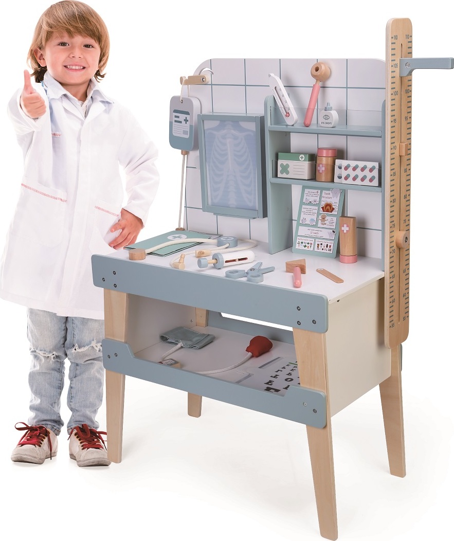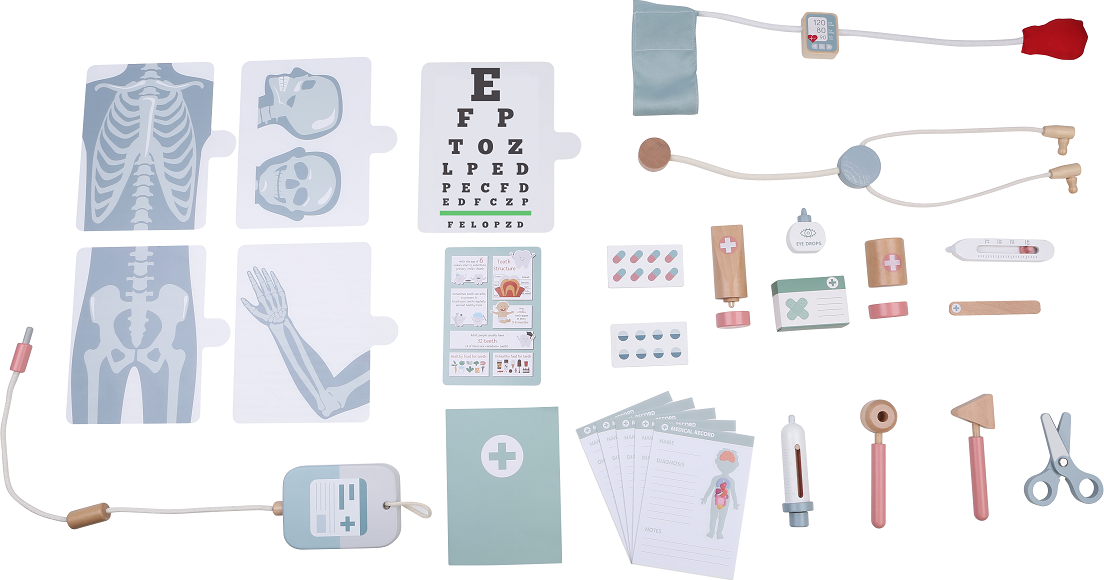 Hra s touto sadou je nejen skvělou zábavou, ale také učením. Děti se učí empatii, zbavení se strachu, zodpovědnosti i péči o druhé. Tato hračka podněcuje představivost, umožňuje objevovat tajemství povolání lékaře a učí rozpoznávat nástroje potřebné pro tuto práci. Hra navíc formuje manuální dovednosti. Znáte výšku svého pacienta? Ne? Pak ho změřte! Změřte mu i tlak nebo teplotu, poslechněte si ho a vše důkladně zapište do karty pacienta. Můžete také zkontrolovat zrak či sluch a nezapomeňte se podívat na rentgenové snímky na funkční podsvícené desce! Sada obsahuje stůl pro vyšetření a zákroky s úložným prostorem a nástroje nezbytné pro práci lékaře. Stetoskop, tlakoměr, teploměr, pinzetu, krabičky na léky a krémy, nůžky, infúzi, 4 RTG snímky, otoskop, injekční stříkačku, kladívko, karty pacientů, kartičky s léky, tabulku pro kontrolu zraku a informativní letáčky.