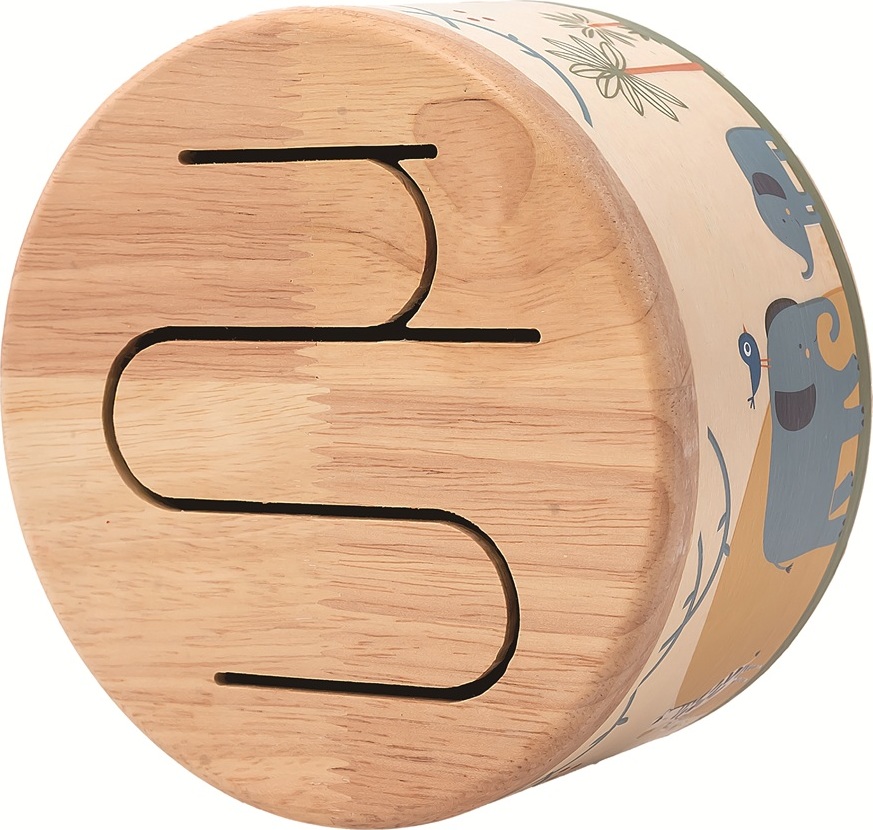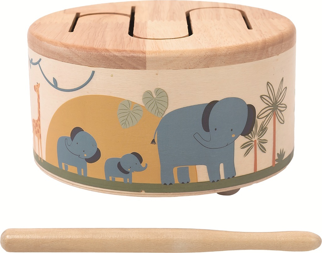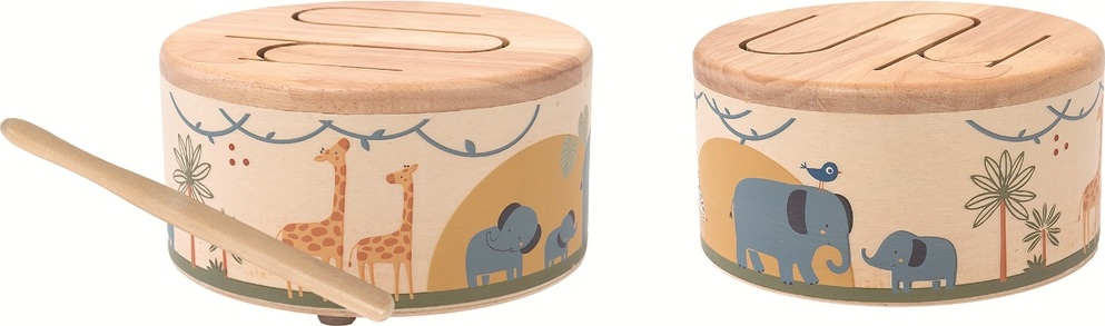 Veselý dřevěný bubínek s motivy safari přináší dětem radost z objevování rytmu i světa zvířátek. Na bubínku najdete roztomilé ilustrace slonů, žiraf a zeber, které okouzlí každé malé dítě. Bubínek je vyroben z kvalitního přírodního dřeva. Je dodáván s jednou paličkou a má ideální velikost pro malé dětské ruce. Podporuje rozvoj jemné motoriky, rytmického cítění a hudebního vnímání. Nejedná se o hudební nástroj, ale pouze o hračku.