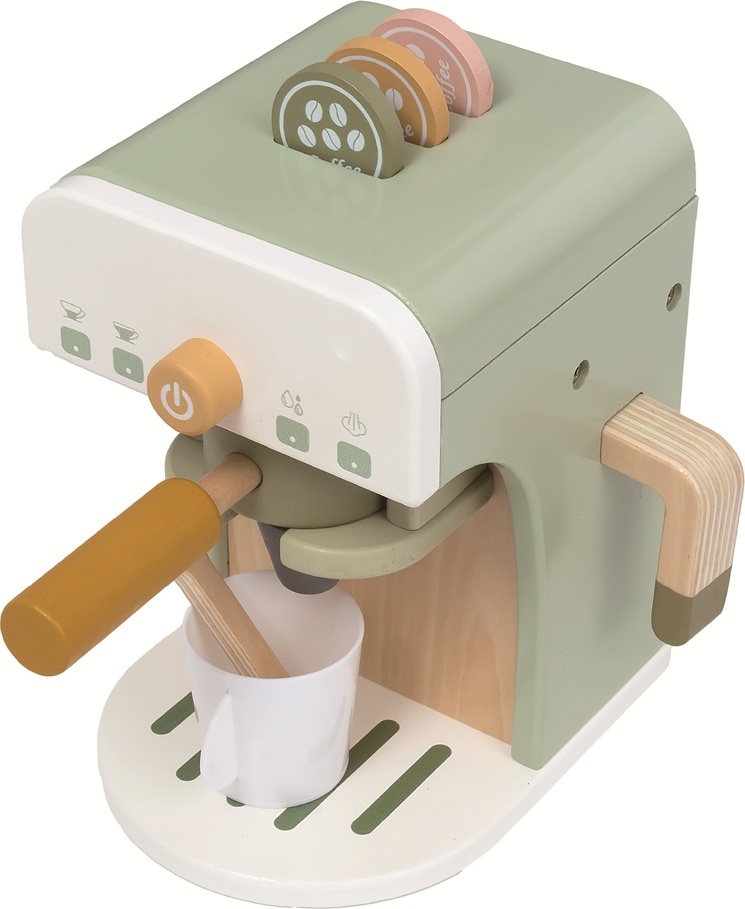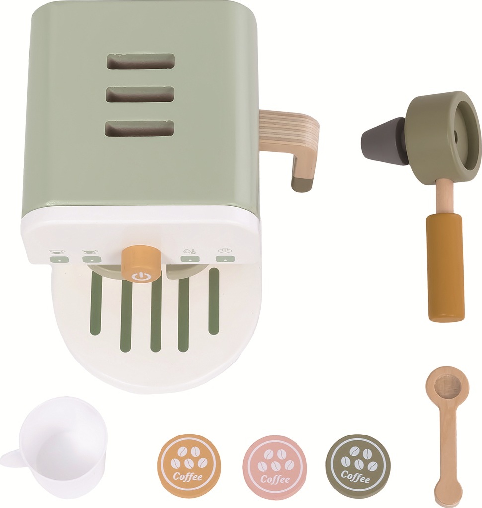 Sada kávovaru s doplňky pro všechny malé baristky a baristy a budoucí milovníky kávy. Je libo espresso nebo cappuccino? Dřevěný pákový kávovar s realistickými detaily má tři vyměnitelné kapsle, hrneček, lžičku a samozřejmě páku na kávu, která se dá zasunout přímo do přístroje. Kapsle si děti mohou uložit do výřezů na horní straně kávovaru.Hračka podporuje představivou hru, rozvíjí jemnou motoriku, koordinaci pohybů i sociální dovednosti. Děti si mohou hrát samy nebo obsluhovat hosty ve své vlastní kavárně. Příjemné pastelové a zemité odstíny barev spolu s kvalitním přírodním dřevem dělají z této hračky krásný doplněk každého pokojíčku.