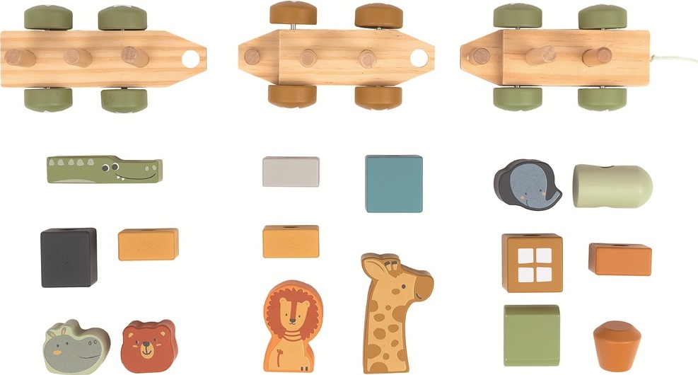 Nasazovací hra ve tvaru vláčku s lokomotivou a 2 vagónky, který veze roztomilá zvířátka, je skvělou pomůckou pro rozvoj jemné motoriky a logického myšlení dětí. Na dřevěných podvozcích jsou umístěny tyče, na které děti nasazují kostičky různých tvarů a stavějí tak barevný vláček. Součástí jsou také kostičky ve tvaru zvířátek – žirafa, slon, medvěd, lev, hroch a krokodýl. Díky připojené šňůrce mohou děti vláček převážet i se zvířátky a využít jako tahací hračku. Při hře si děti procvičují koordinaci ruka-oko, zlepšují úchop a přesnost pohybu, což přispívá k celkovému rozvoji motorických dovedností. Nasazování tvarů na správná místa podporuje koncentraci, trpělivost i schopnost řešit jednoduché úkoly. Děti se také učí rozpoznávat a pojmenovat barvy a zvířátka, což podporuje zrakové vnímání a jazykový rozvoj. Tato didaktická hračka je vhodná pro malé děti od 1,5 roku a nabízí zábavnou formu učení prostřednictvím hry.