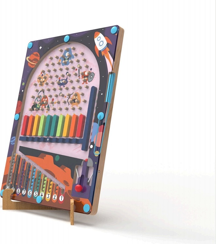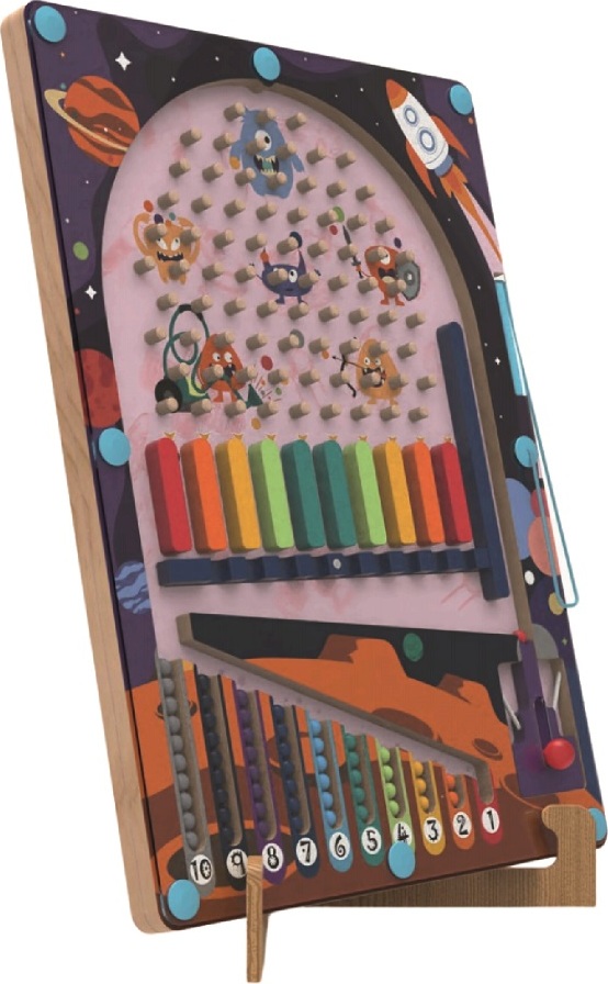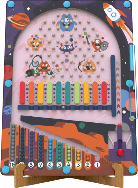 Originální dřevěná hra s vesmírným motivem nabízí dětem hned dvě možnosti, jak si užít spoustu zábavy: klasický pinball s vystřelováním kuliček a magnetickou hru se sbíráním bodů. Barevná hrací deska je navržena tak, aby podporovala zručnost, soustředění a trpělivost. Pomocí vystřelovače (katapultu) se hráči snaží dostat magnetické kuličky co nejpřesněji do vybraných polí a získat co nejvíce bodů. Přehledné uspořádání hrací plochy umožňuje snadné sledování výsledků a zároveň děti učí počítat body. Díky praktickému stojánku lze hru pohodlně postavit na stůl.Zábavná hra, která rozvíjí postřeh, jemnou motoriku a logické myšlení. Ideální pro samostatné hraní nebo zábavné soutěžení s kamarády a rodiči.