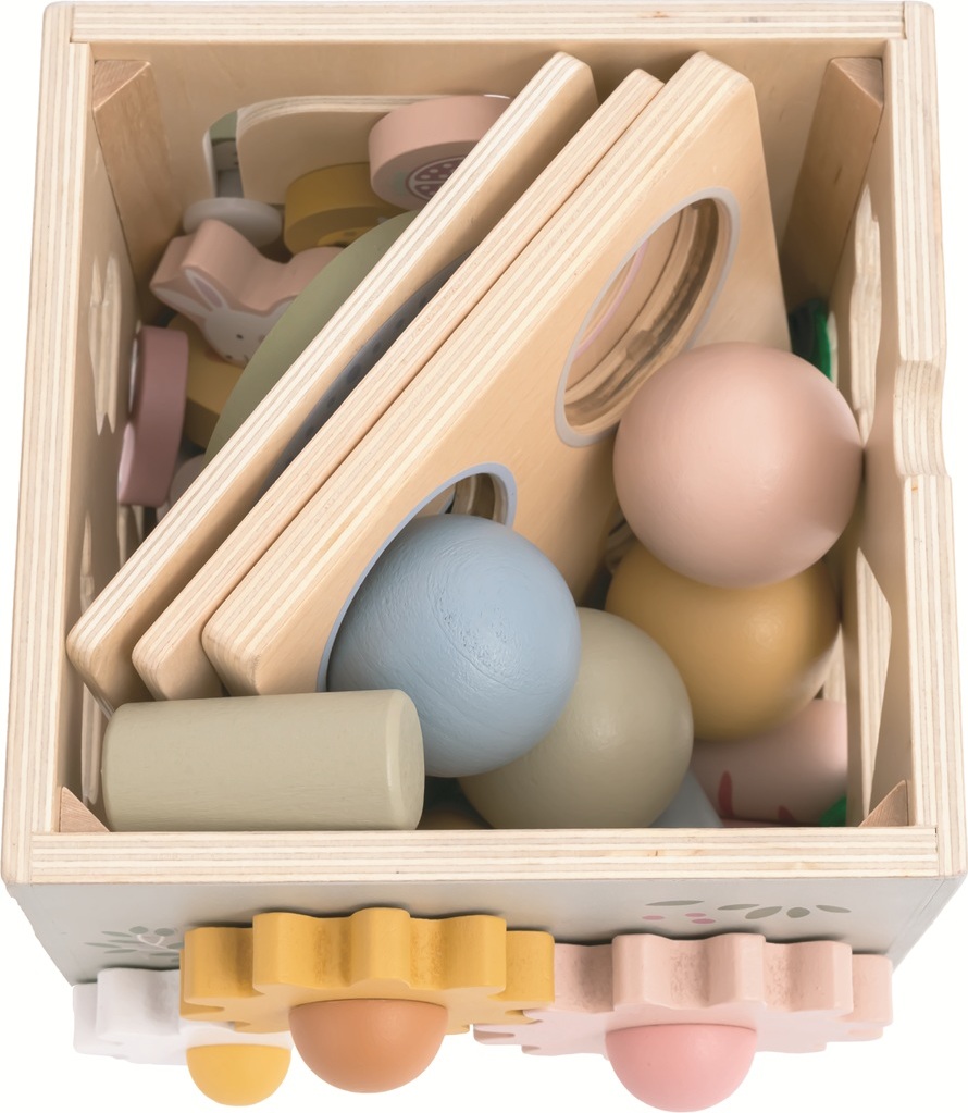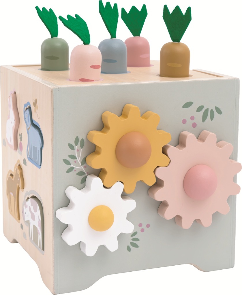 Objevujte svět a učte se zábavnou formou! Dřevěná motorická kostka s motivy farmy nabízí dětem pestrou škálu herních aktivit, které rozvíjejí jemnou motoriku, logické myšlení i koordinaci ruka-oko. Každá strana kostky přináší jinou zábavnou výzvu – od vkládání zvířátek, přes otáčení ozubenými kolečky, až po barevné vkládačky nebo jednoduché počítání. Hračka navíc obsahuje vyměnitelná víka s různými herními možnostmi. Děti mohou například přiřazovat obrázková kolečka ke správným předlohám a tím trénovat zrakové vnímání, třídění a soustředění. Nechybí ani oblíbená zatloukací hra, při které lze zatloukat dřevěné mrkvičky nebo kuličky. Během hry se děti učí rozpoznávat základní tvary, barvy i zvířátka. Veškeré díly lze uložit uvnitř kostky, takže po hraní zůstává vše pohromadě a nic se neztratí. Díky jemným pastelovým barvám a roztomilým ilustracím zvířátek je hračka nejen atraktivní a zábavná, ale je i pěkným doplňkem dětského pokojíčku či herny.