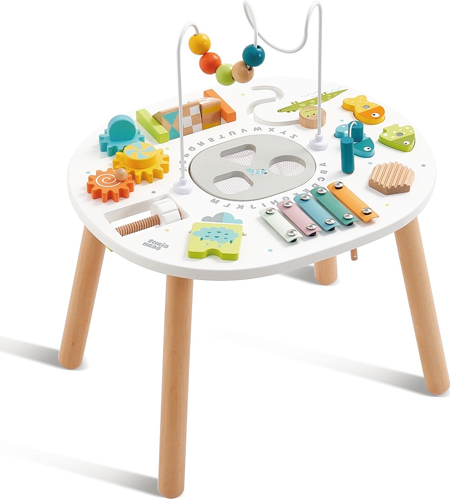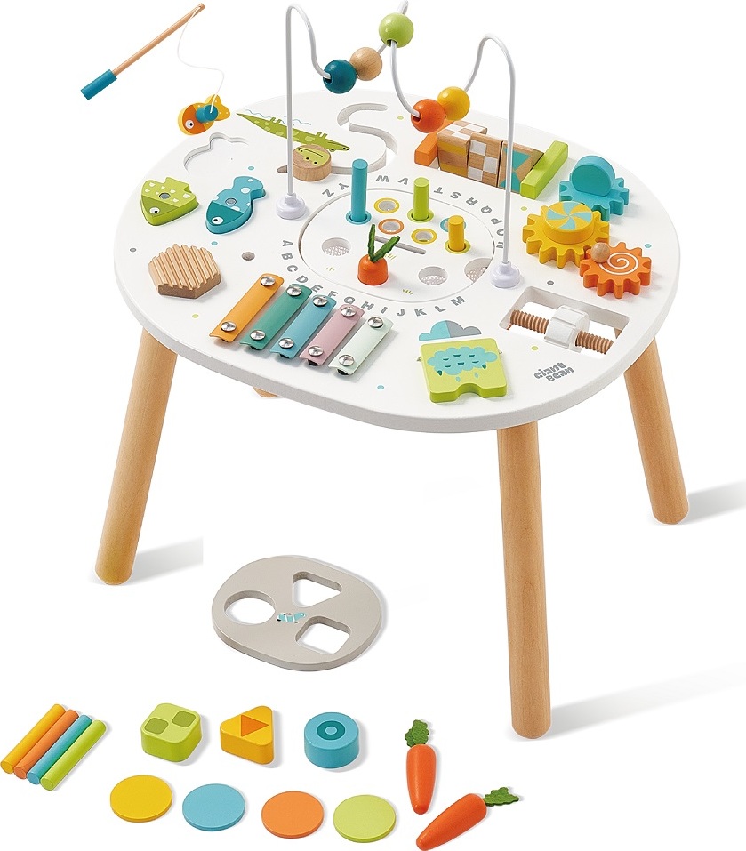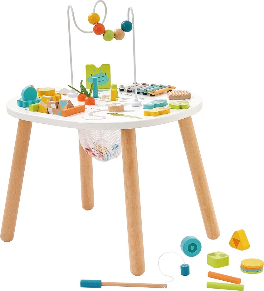 Tento multifunkční motorický stůl potěší nejen oko, ale také ostatní smysly. Perfektní hračka pro batolata, pomůže s rozvojem představivosti. Stoleček je plný multisenzorických aktivit, které zabaví všechny zvídavé děti. Najdou na něm korálkový labyrint, vkládačku, xylofon, ozubená kolečka, magnetické chytání rybiček a další! Takový počet aktivit děti zabaví na dlouhé hodiny. Tento robustní stoleček vám vydrží opravdu dlouho, je vyroben ze dřeva a dekorován jemnými barvami.