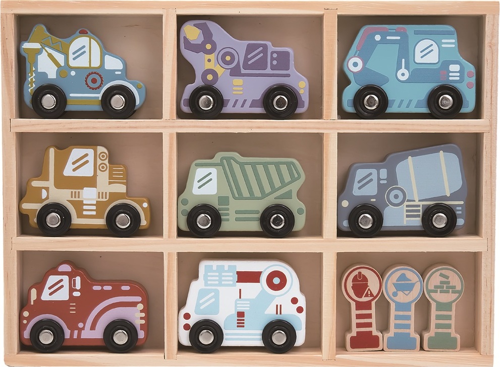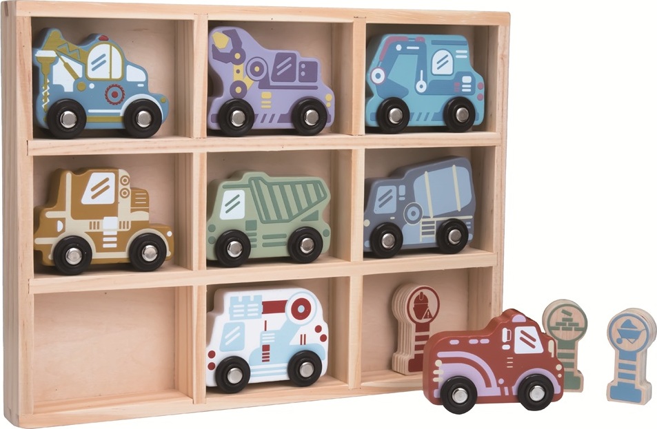 Sada 8 dřevěných autíček a 3 značek v praktické poličce je skvělým doplňkem dětského pokojíčku nebo herny. Obsahuje různá vozidla - cisternu, hasičské a policejní auto, bagr a další, která inspirují k představivé hře a podněcují dětskou fantazii. Autíčka jsou přizpůsobena pro malé dětské ruce, snadno se uchopují a dobře se s nimi manipuluje. Hraním si děti rozvíjejí jemnou motoriku, obratnost i koordinaci pohybů. Zároveň si při vytváření vlastních příběhů a situací posilují kreativní myšlení a komunikační schopnosti. Polička slouží nejen k praktickému uskladnění autíček, ale také jako stylový doplněk, který v dětském pokoji hezky vynikne a udrží hračky vždy pěkně po ruce.