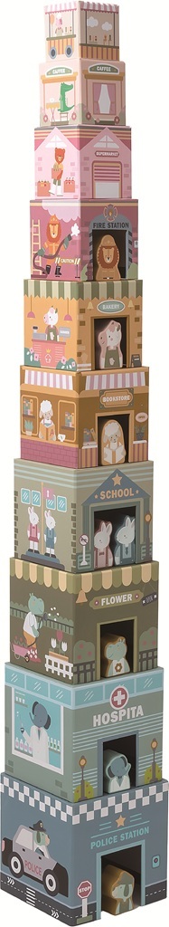 Skládání je zábava! Tato dřevěná věž v jemných pastelových barvách se skládá z 10 kostek různých velikostí, které děti mohou stavět na sebe jako vysoký mrakodrap nebo rozložit vedle sebe jako městečko. Každá kostka představuje jinou městskou budovu. Najdete zde nemocnici, školu, knihkupectví, květinářství i supermarket. Na stranách kostek jsou detailní ilustrace budov a 6 kostek má také okýnko, kde si děti mohou schovat dřevěné figurky, roztomilé zvířecí postavičky, které představují různá povolání. Víte, do kterého domečku patří slon, pejsek nebo lev? Díky skládání, třídění a hraní si děti rozvíjejí motoriku, logiku, kreativitu i porozumění tvarům, barvám a rolím ve městě. Věž lze snadno skládat a rozkládat a díky tomu je ideální nejen na doma, ale i na cesty. Poslouží také dobře jako kulisy, rozvíjí fantazii dětí a povzbuzuje k představivé hře. Ať už jako věž nebo kulisy ke hře, hračka přináší nekonečné možnosti zábavy!