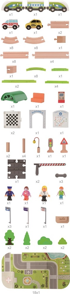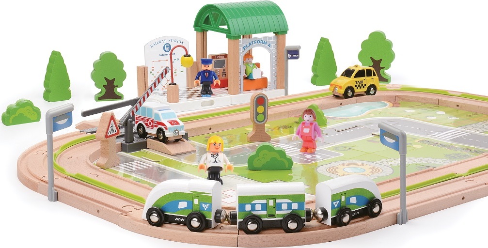 Tato detailně propracovaná dřevěná vláčkodráha s motivem vesničky nabízí dětem nekonečné možnosti hry. Obsahuje vše, co potřebují k vytvoření vlastního malého světa: vláček se třemi vagony, koleje, stanici, zvedací závoru, taxi, sanitku, figurky lidí, semafory, dopravní značky, stromy a potištěnou podložku s ulicemi a přechody. Všechny prvky jsou navrženy tak, aby rozvíjely představivost, jemnou motoriku a fantazii. Každá jízda může být jiná – děti mohou naložit pasažéry, projet vesnicí, zastavit u stanice nebo se vyhnout autům na silnici. Ideální jako dárek nebo doplněk dětského pokojíčku. A pro ještě větší zábavu lze vláčkodráhu kombinovat se sadou Vláčkodráha Město 90 dílů (kód produktu 2D98209) – společně vytvoří barevné a rozmanité železniční městečko!