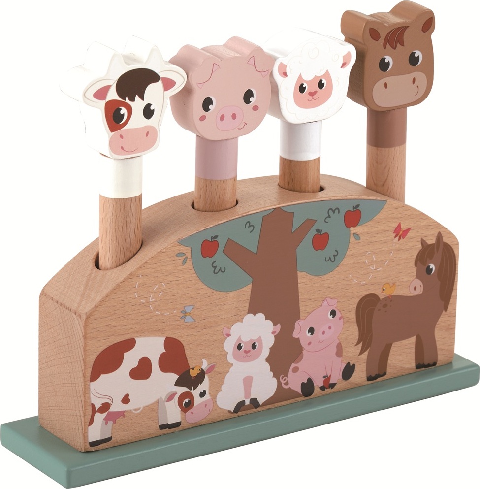 Kdo to tady poskakuje? Kravička, prasátko, ovečka a koník! Dřevěná vystřelovací hračka s roztomilými obličeji v zemitých barvách. Když zvířátko zasunete do otvoru a zatlačíte, pružina uvnitř ho vystřelí nahoru. To bude legrace! Skvělá dřevěná hračka, která trénuje motoriku dětí a rozesměje každého. Díky základně je také velmi stabilní. Hravý design, příjemné odstíny barev spolu s kvalitním přírodním dřevem dělají z této pop-up hry krásný doplněk každého pokojíčku nebo herny.