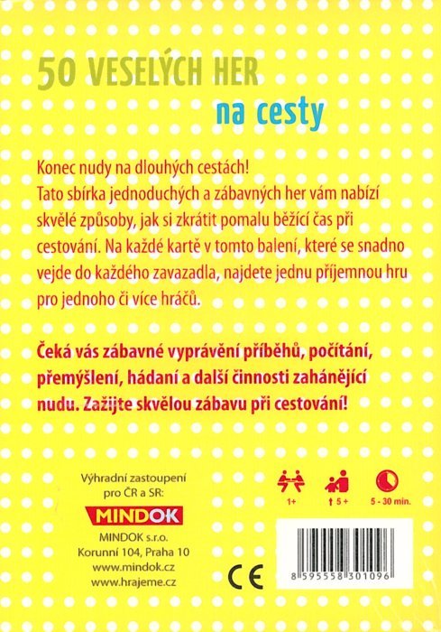 Zažijte skvělou zábavu při cestování! Tato sbírka jednoduchých a zábavných her vám nabízí skvělé způsoby, jak si zkrátit pomalu běžící čas při cestování. Na každé kartě v tomto balení, které se snadno vejde do každého zavazadla, najdete jednu příjemnou hru pro jednoho či více hráčů. Čeká vás zábavné vyprávění příběhů, počítání, přemýšlení, hádaní a další činnosti zahánějící nudu.Vlastnosti