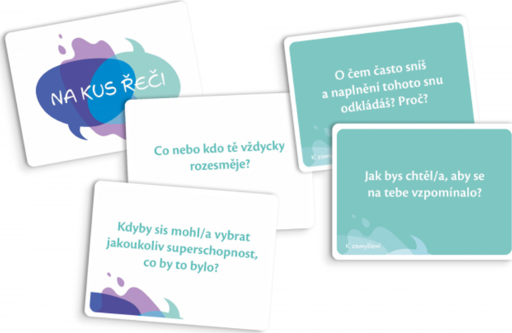 Na kus řeči je sada konverzačních karet, jejichž účelem je pomoci rozproudit či obohatit konverzaci o zajímavá témata, k nimž se třeba často obtížně hledají cesty.