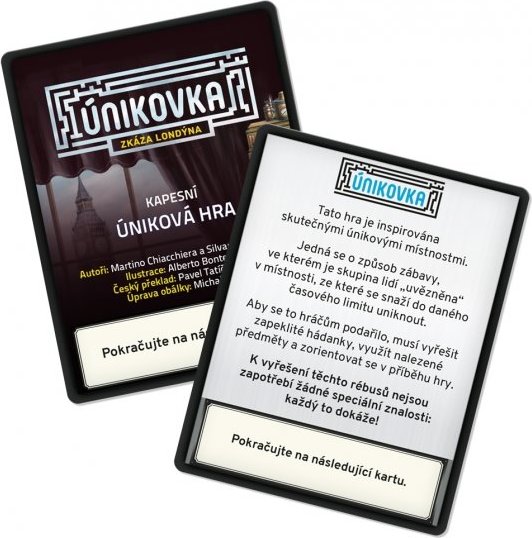 Kapesní verze celosvětově populárního fenoménu! Tajný agent si vás zvolil jako ty nejlepší detektivy ze Scotland Yardu pro nebezpečnou misi nejvyšší priority. Londýn je v ohrožení a je jenom na vás, jestli se dočká zítřejšího dne. Zvládnete najít všechna čtyři ukrytá zařízení a deaktivovat je ještě před půlnocí, nebo je osud Londýna zpečetěn? Únikovka je karetní variací na populární únikové hry, při nichž se skupina přátel nebo kolegů (lze hrát i v jednom hráči) nechá zamknout do místnosti plné rébusů a snaží se z ní v časovém limitu uniknout pryč. I karetní hra Únikovka je plná rébusů, které musíte vyřešit chcete-li uspět. A uspějete nebo selžete všichni - Únikovka je totiž kooperativní hra, tudíž hrají všichni hráči spolu a ne proti sobě. Hráči společně procházejí balíčkem karet, čímž se jim odhalují nová pravidla a nové rébusy. Některé karty představují hlavolamy, jiné nápovědy a další předměty, které se budou později hodit.