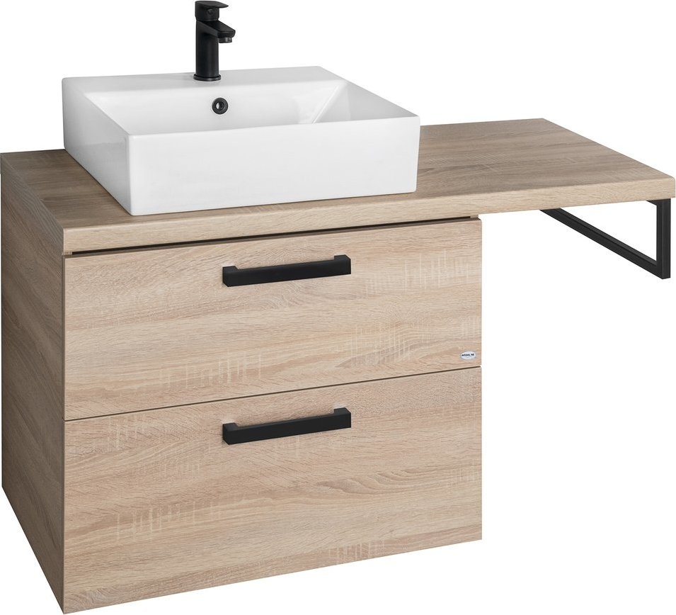 Koupelnový nábytek VEGA s deskou VEGA (HPL) v dekoru dub platin lze kombinovat s umyvadly na postavení.