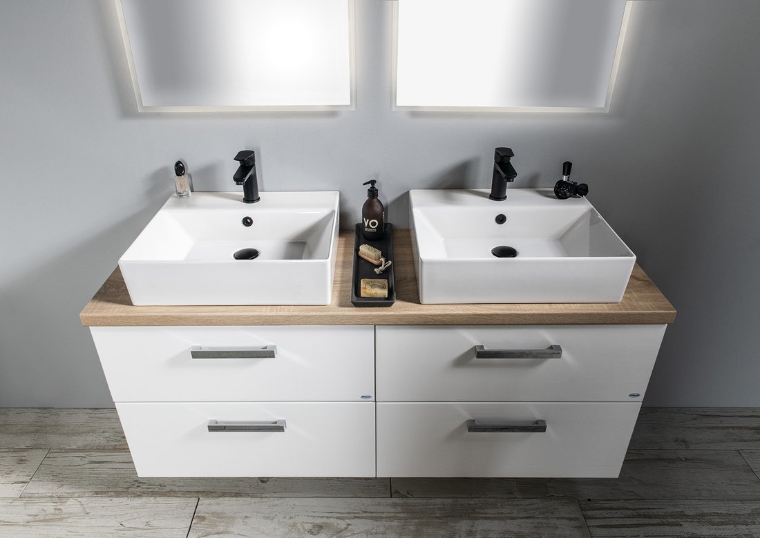 Koupelnový nábytek VEGA s deskou VEGA (HPL) v dekoru dub platin lze kombinovat s umyvadly na postavení.