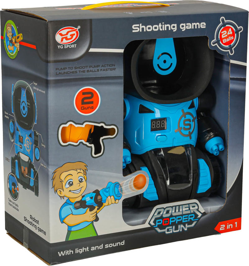 Hladový robot je dovednostní hra, kde cílem je trefit robota do hlavy, což pomáhá zlepšit míření. Sada obsahuje dvě zbraně a 24 pěnových míčků ve dvou barvách, což vám umožní uspořádat turnaj v přesnosti. Munice se nabíjí zepředu hlavně a výstřel se provádí zatlačením zadní části zbraně dopředu.