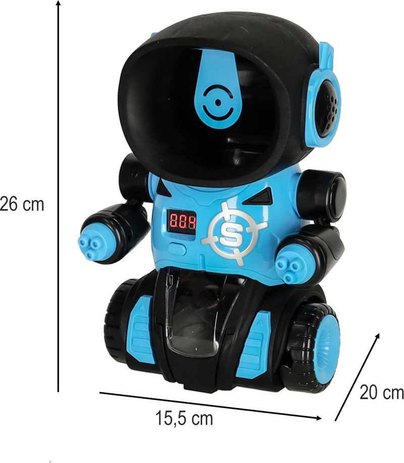 Robot je napájen dvěma AA bateriemi (nejsou součástí balení). Je vybaven LCD displejem, který počítá získané body a povzbuzuje hráče k dosažení lepších výsledků. Tato hračka podporuje rozvoj míření a jemné motoriky dětí a také podporuje zdravou soutěživost.