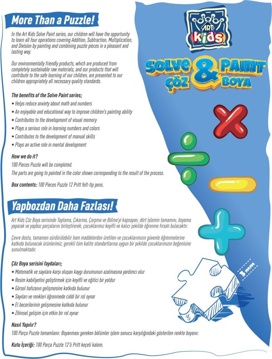 V sérii Art Kids Solve Paint budou mít naše děti možnost naučit se příjemným způsobem za pomoci malování naučí základní matematické operace: sčítání, odčítání, násobení a dělení. bezpečné učení dětí pomáhá snižovat úzkost z matematiky a čísel příjemný a vzdělávací způsob, jak zlepšit malování přispívá k rozvoji vizuální paměti a manuální zručnosti šetrné k životnímu prostředí vyráběno ze zcela udržitelných surovin Návod: Složte puzzle, podle výsledku výpočtu vybarvěte políčko barvou se stejným číslem jako výsledek. Obsahuje: 100 dílků puzzle, 12 fixů Rozměr složeného puzzle cca 48 x 34 cmVlastnosti