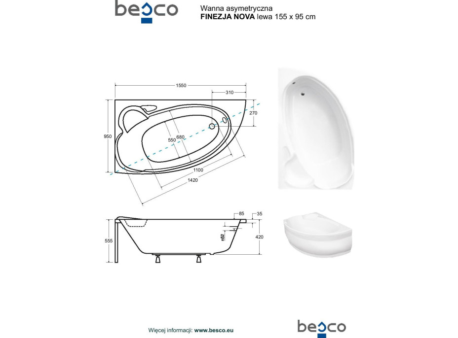 Asymetrická rohová vana FINEZJA NOVA je vyrobena z kvalitního sanitárního akrylátu, který uspokojí i ty nejnáročnější požadavky, navíc s praktickým sedátkem. Vana s atraktivní hloubkou 42 a 43 cm poskytuje dostatek místa a pohodlí i tam, kde jste si to zatím nemohli dovolit.