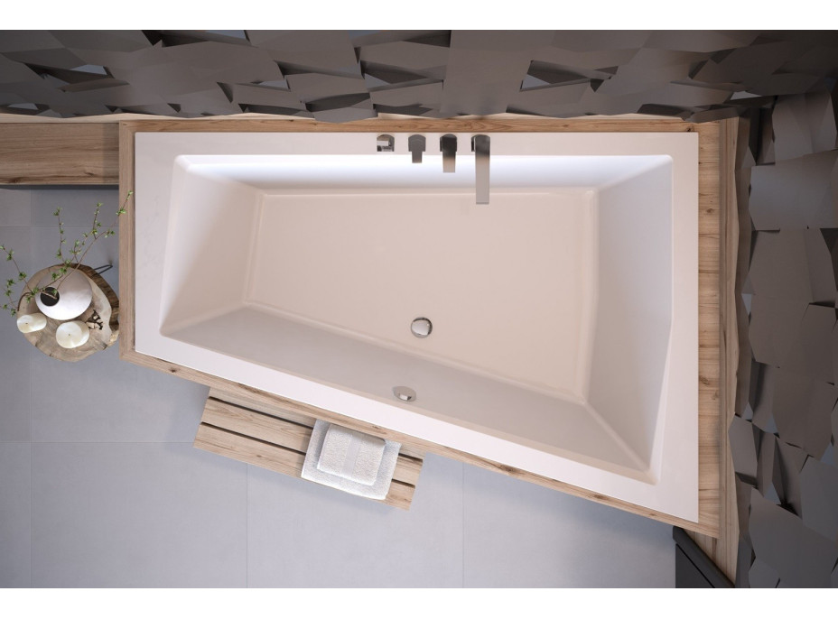 Designová asymetrická vana pro dvě osoby INTIMA DUO SLIM s ostrými křivkami s velmi nízkou hranou (pouhých 15 mm). Tato vana je vhodná spíše do menších koupelen. Vana nabízí oboustranné ležení
