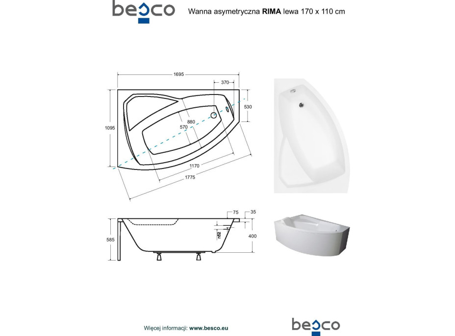 Asymetrická rohová vana RIMA je vyrobena z kvalitního sanitárního akrylátu, který uspokojí i ty nejnáročnější požadavky. Nabízíme u ní záruku 10 let. Asymetrická vana RIMA s úhlopříčně řešeným vnitřním prostorem je nejoblíbenějším modelem.