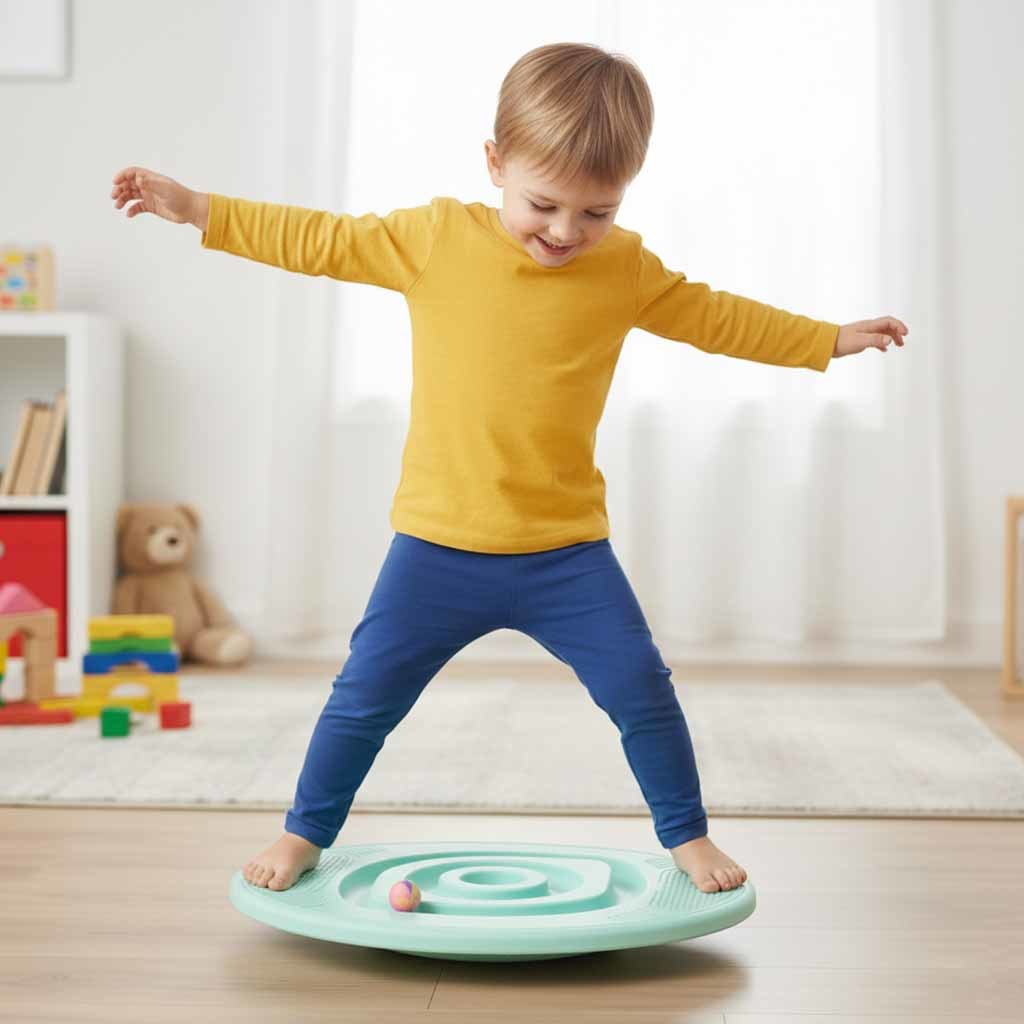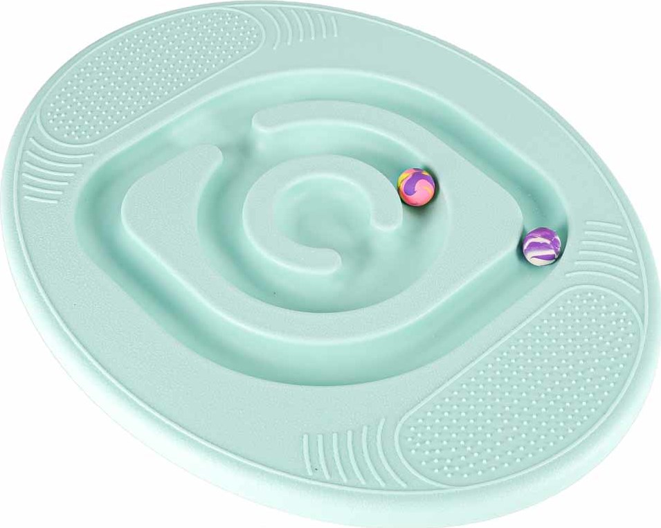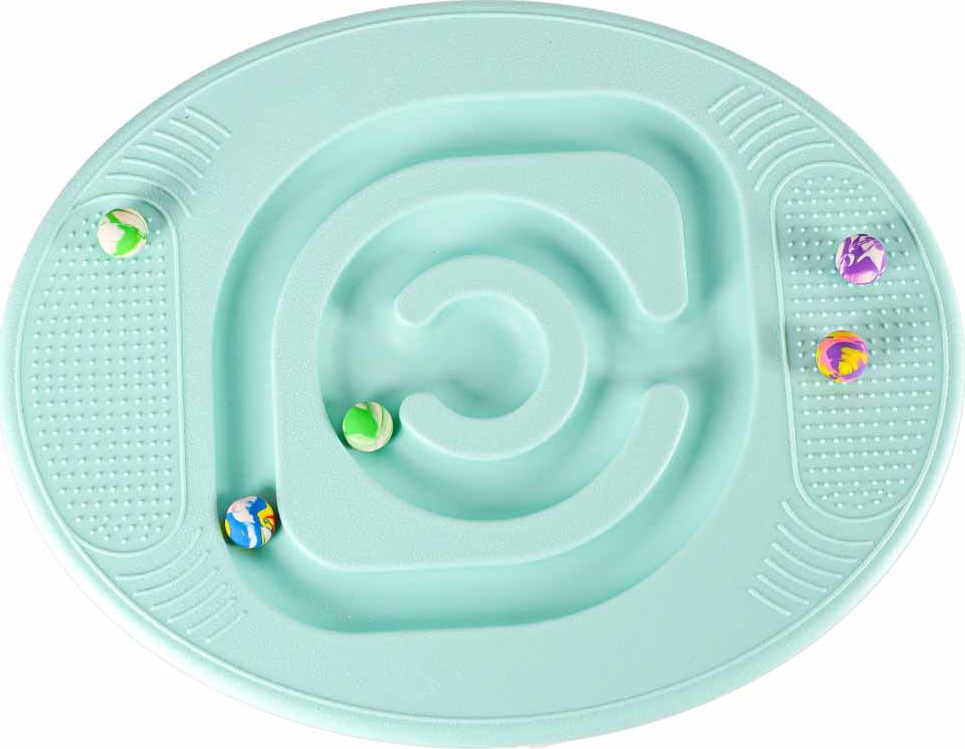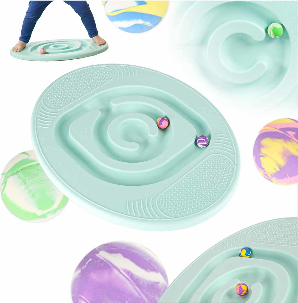 Tato unikátní deska kombinuje dynamický pohyb s logickým prvkem, který stimuluje soustředění a učí přesnosti. Na rozdíl od běžných balančních desek nabízí tato deska dětem další výzvu: úkolem není jen udržet rovnováhu, ale také navést jeden z pěti gumových míčků do středu spirálového bludiště. To vyžaduje soustředění, koordinaci a úplnou kontrolu nad každým pohybem – přesto poskytuje obrovské uspokojení, když míček konečně dosáhne svého cíle. Vyvýšené prvky na povrchu desky slouží dvojímu účelu. Na jedné straně zvyšují bezpečnost tím, že zabraňují uklouznutí, a na druhé straně stimulují hmat, čímž podporují smyslový vývoj dětí. Je to vynikající nástroj pro bezstarostné každodenní hraní, ale i pro procvičování rovnováhy, koordinace a zlepšování jemné a hrubé motoriky.