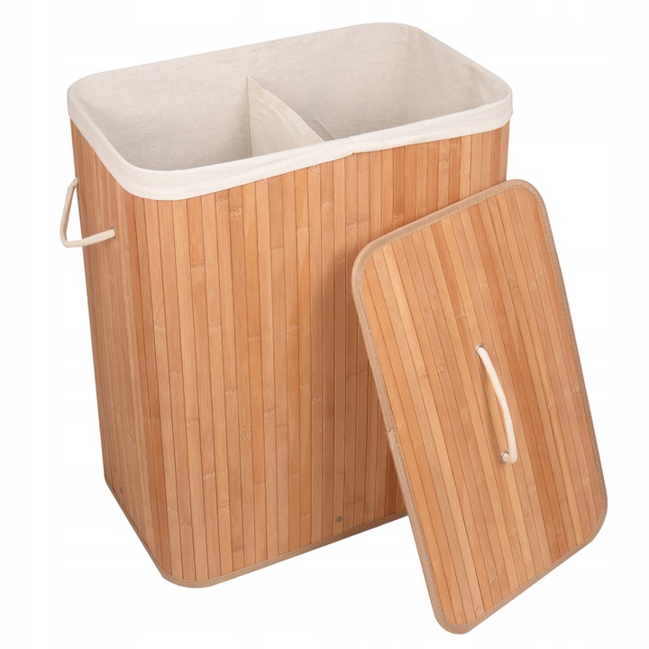 Koš je vyroben z přírodního bambusu. Prádelní koš je velmi prostorný a jeho objem je 100 litrů. Uvnitř je koš rozdělen na dvě velké přihrádky, díky tomu můžete prádlo již v koši oddělit například na bílé a barevné. Vnitřní vak je vyrobený z prodyšné textilie a může se prát na teplotu 30° C. Prádelní koš je velmi pevný a stabilní a díky dvěma bočním úchytům ho budete moci libovolně přemísti. Součástí prádelního koše je také víko s úchytem.