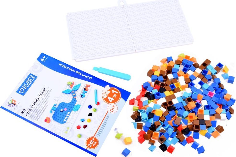 Kreativní sada pro vytváření barevných obrázků vlastníma rukama. Sada se skládá z plastových kostiček, které se umísťují na hrací plochu. Kostičky by měly být přitisknuty na desku tak, aby tvořily obrázek. Můžete reprodukovat obrázky podle obrázkového návodu nebo si vymyslet vlastní.