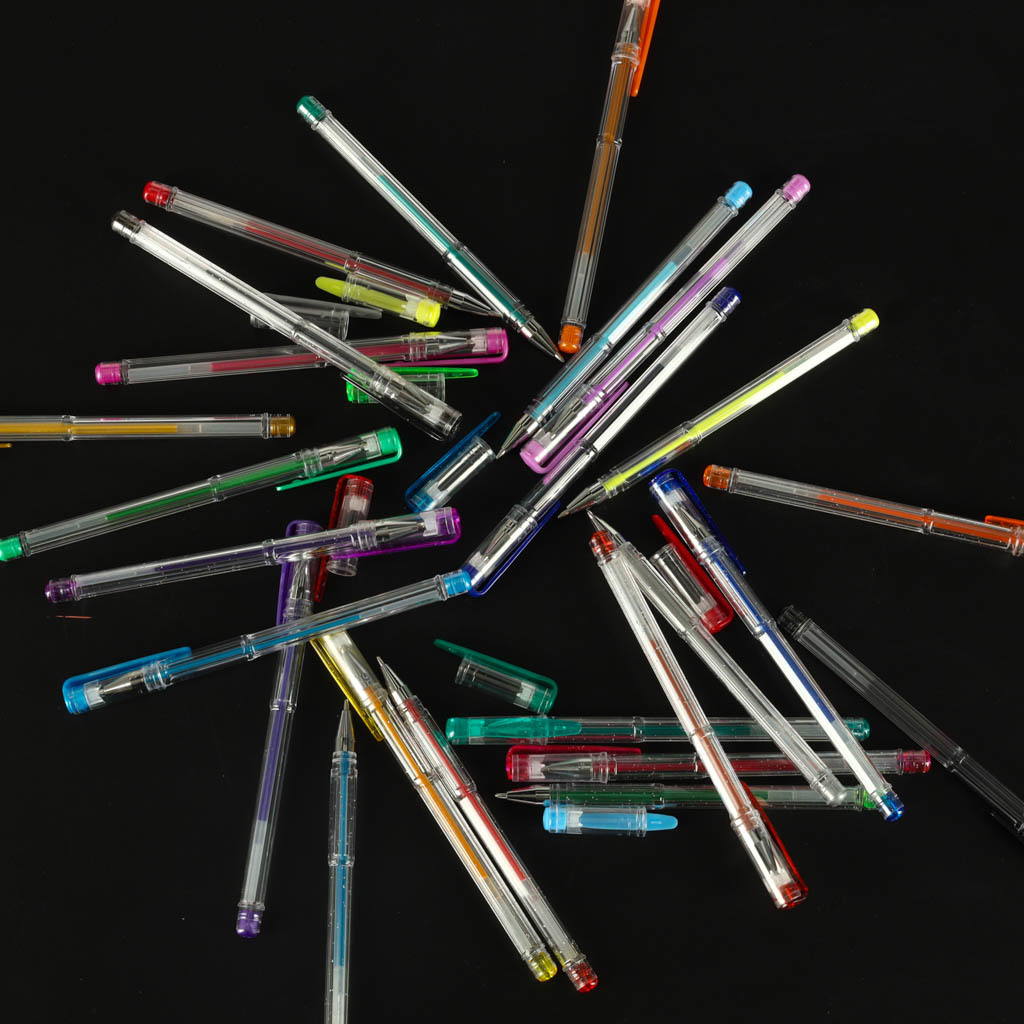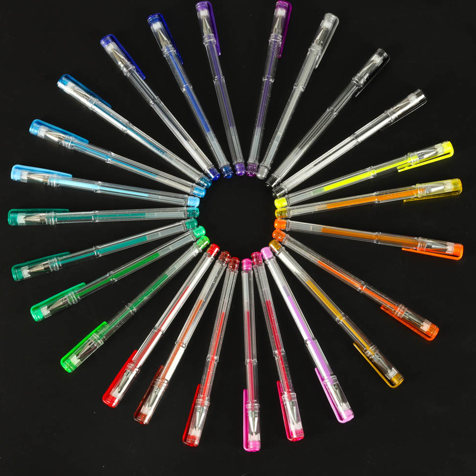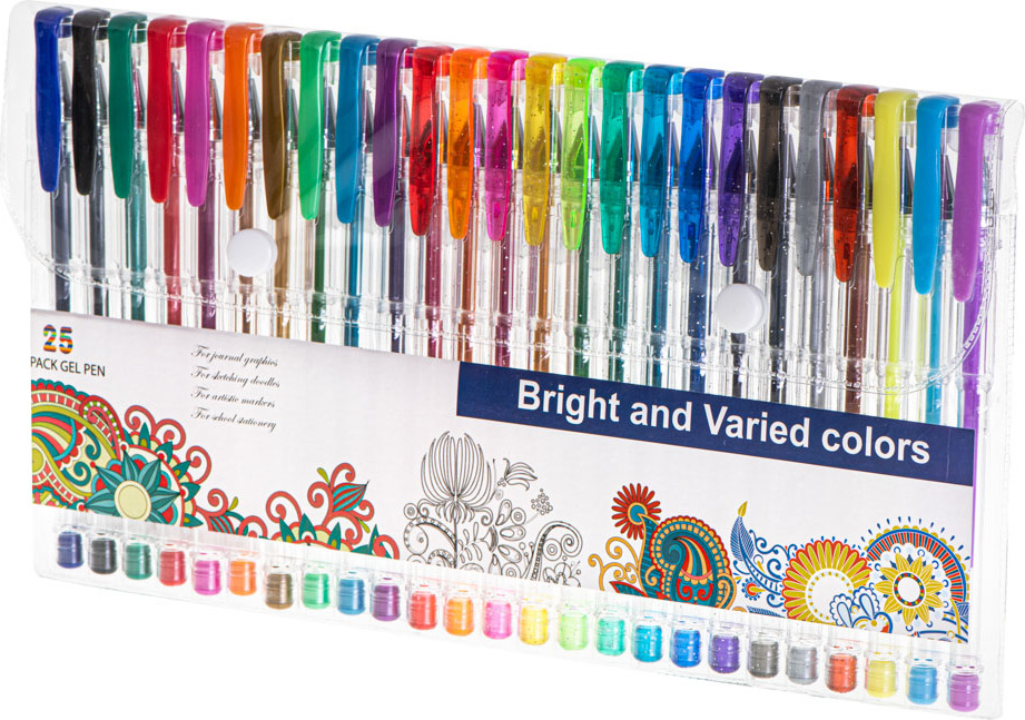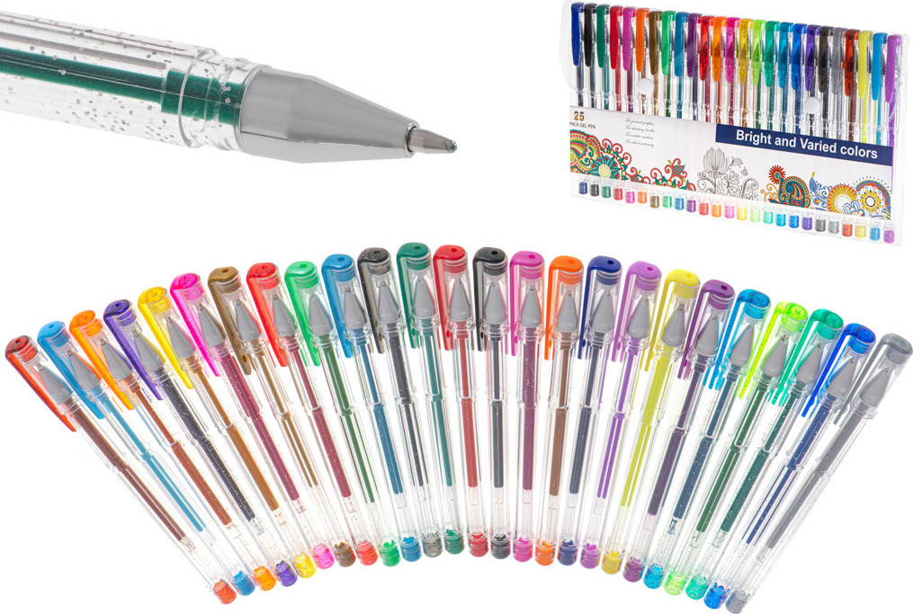 Sada gelových per je skvělou volbou ro malé i velké. Díky 25 kusům si můžete vybrat perfektní barvu podle svých aktuálních potřeb a přání! Gelová pera jsou určena pro psaní a kreslení na papír a nepochybně uspokojí i ty nejnáročnější! Spousta zábavy a kreativní hry zaručena! Skládá se z různých typů per - vytvořené kresby a nápisy tak budou rozmanité a zajímavé! K dispozici je až 12 třpytivých per! Díky nim dodáte svým výtvorům úžasný lesk a styl! Další typ pera má náplně s metalickým inkoustem, které dodají syrovou a jedinečnou atmosféru - bezpochyby vás zaujmou! 7 dalších barev umožní rozvinout vaši fantazii! Sada je doplněna 6 pery v různých barvách (i fluorescenčních). Všechny jsou plné a syté, takže jsou ideální pro vytváření krásných dekorací, přáníček a všeho, co vás napadne!
