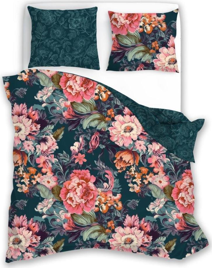 Bavlněné povlečení FLOWERS - růžové/tmavě zelené - 220x200 cm