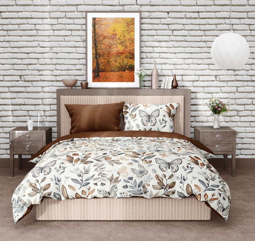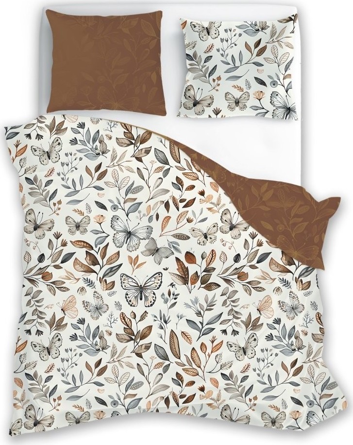 Bavlněné povlečení GUSTO Listy a motýlci - krémové/hnědé - 220x200 cm