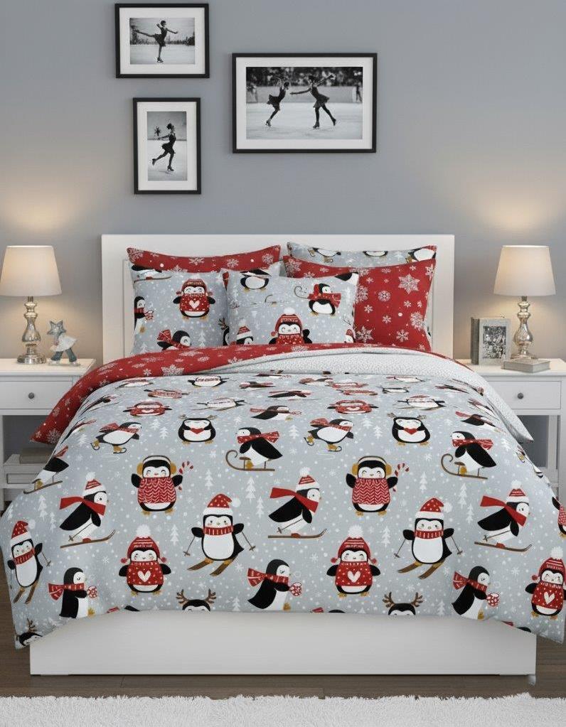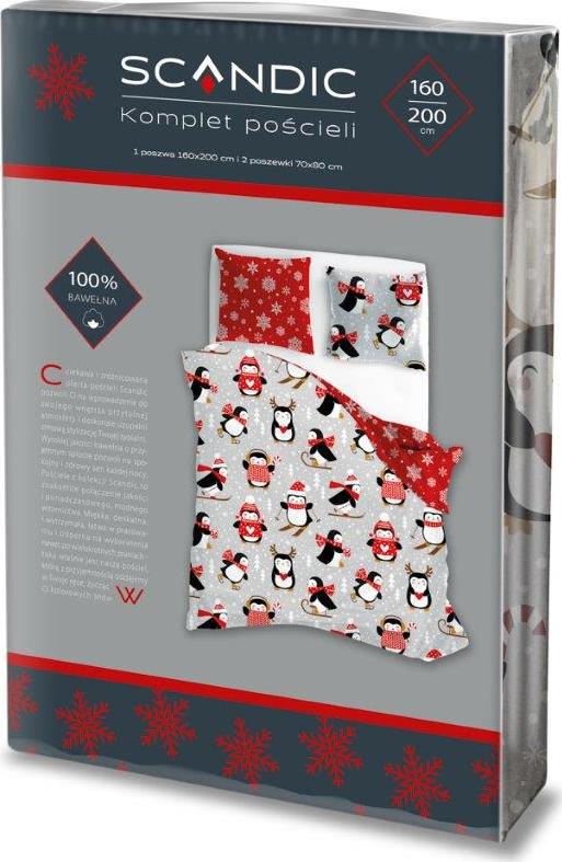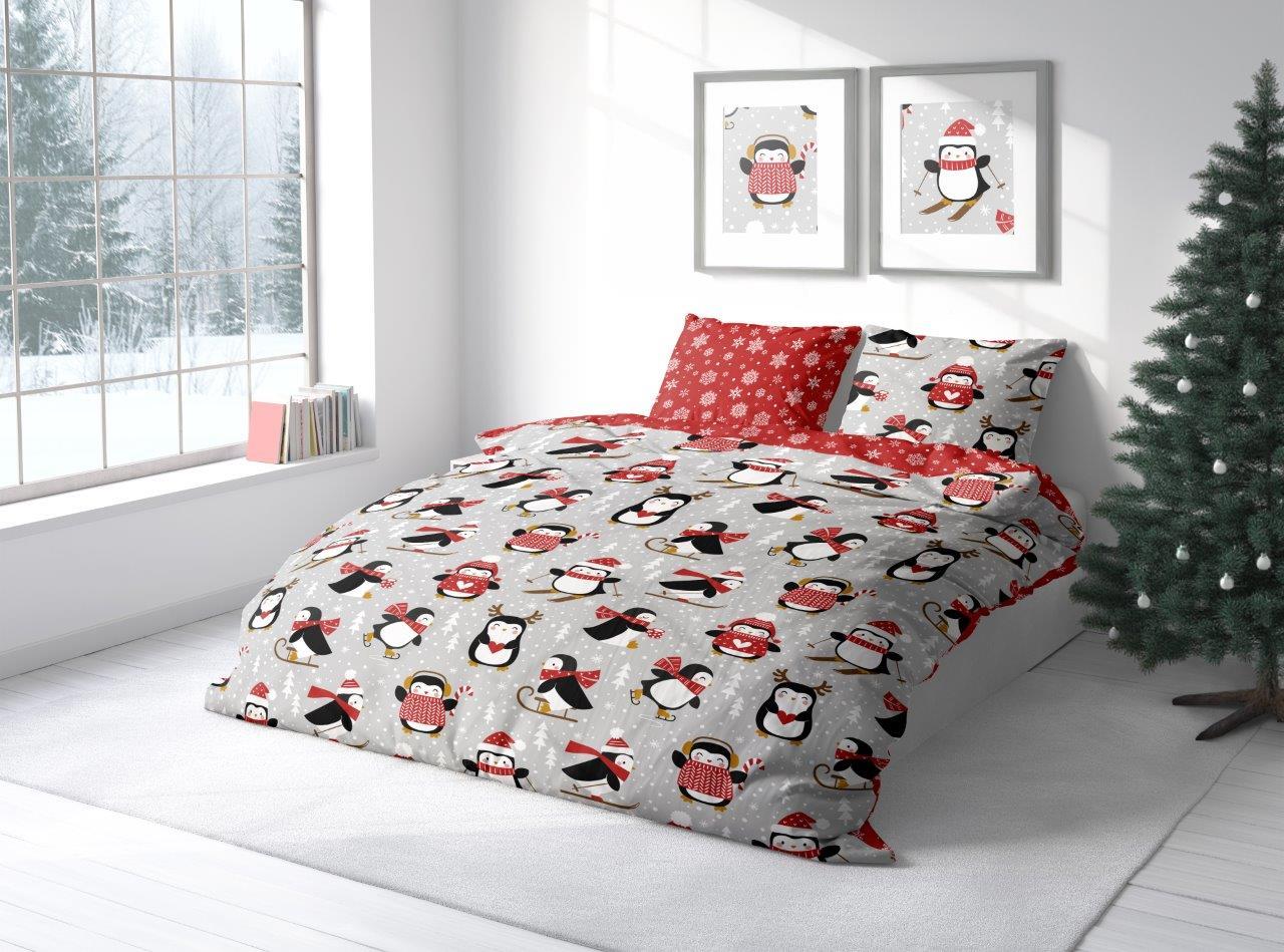 Bavlněné povlečení SCANDIC Tučňáci - šedé/červené - 160x200 cm