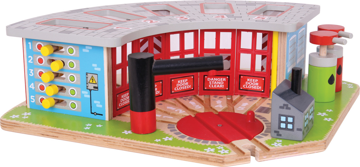 Žádná železnice by nebyla úplná bez těchto garáží pro 5 různých vlaků. S dvířky a dvěma sudy na olej lze pohybovat. Balení obsahuje funkční točnu, otevírací dvířka a dvě čerpadla.