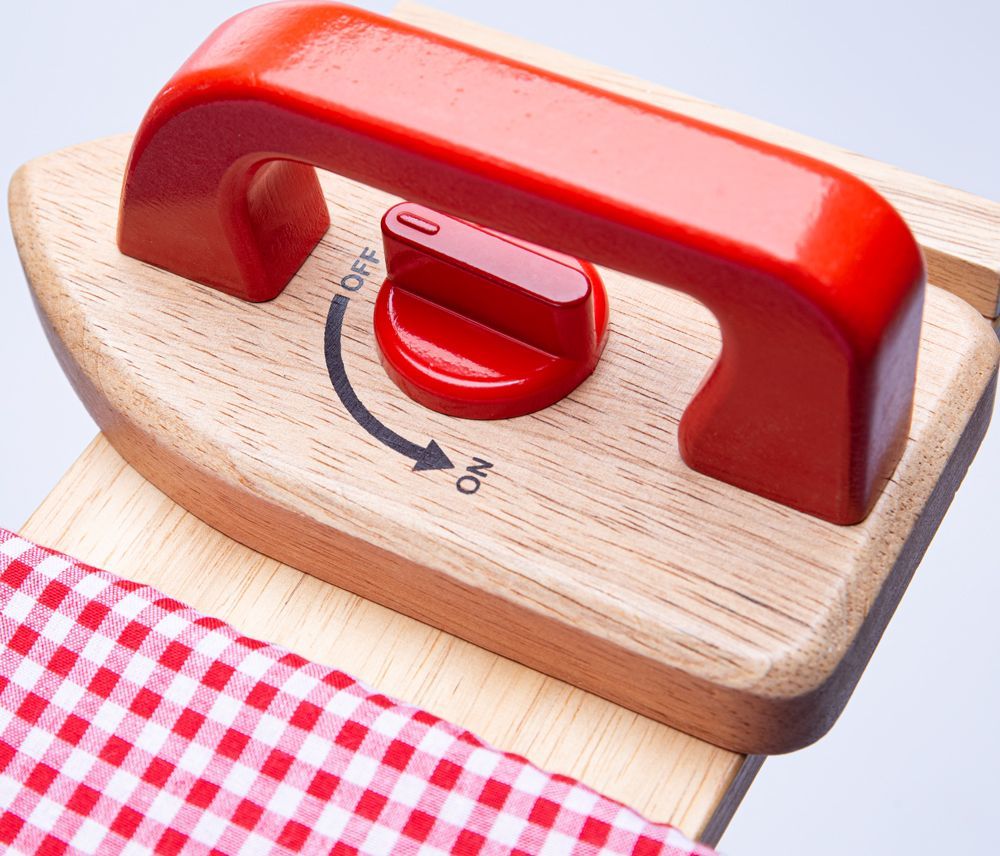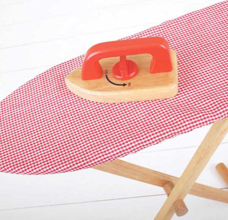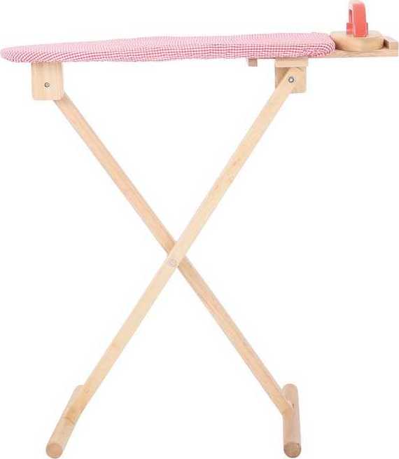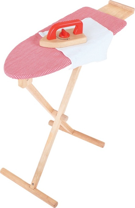 - obsahuje dřevěné žehlící prkno potažené látkou a dřevěnou žehličkou
