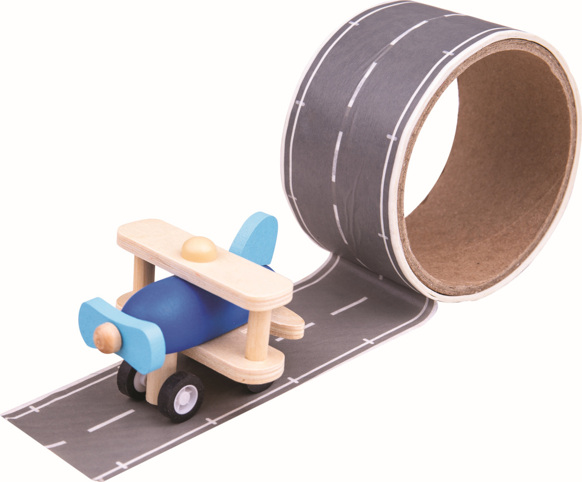 Snadno použitelná vzletová a přistávací dráha. Stačí ji odlepit a přilepit na libovolné místo. Součástí pásky je také dřevěné letadlo.
