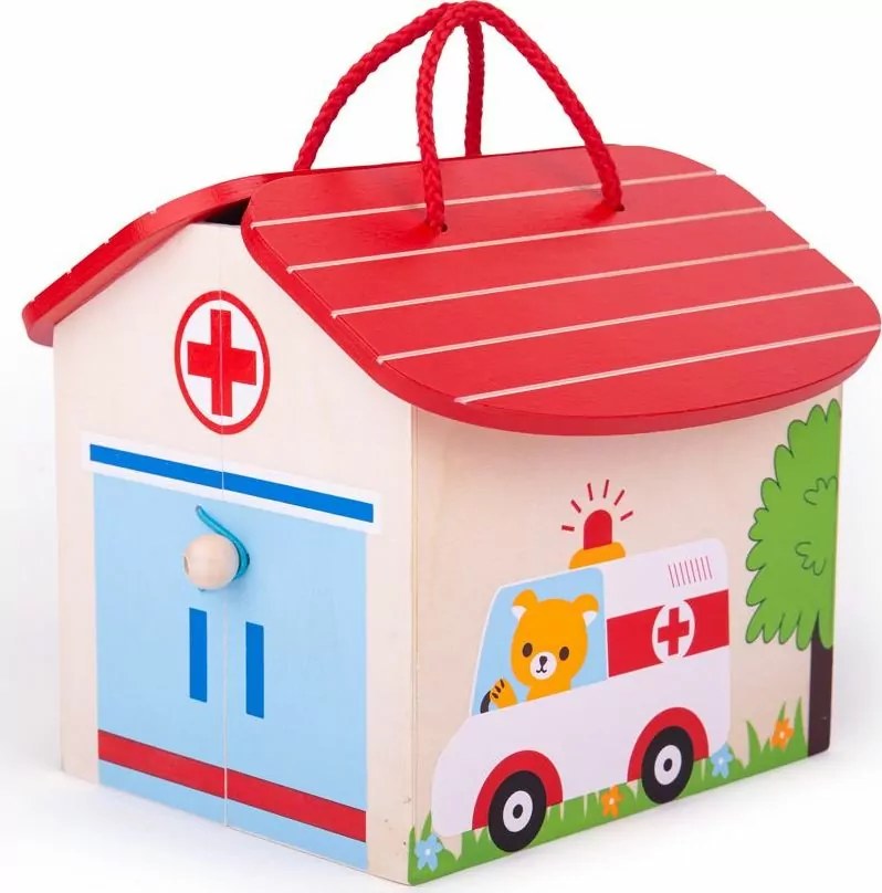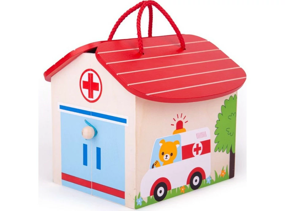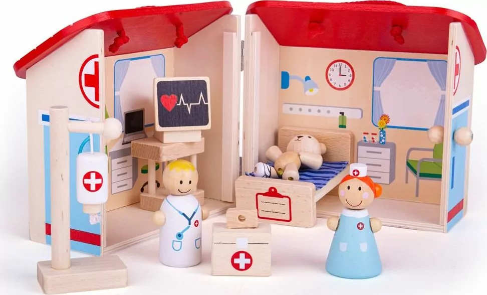 Pan Medvěd se praštil do hlavy! Tato pestrobarevná dřevěná mini nemocniční herní sada má uvnitř i zvenčí funkcemi prvky a je dodávána s nemocničním lůžkem, lékařskou kapačkou, srdečním monitorem, medvědem, sestřičkou a lékařem. Rukojeť a bezpečná spona zajišťují, že tato sada je vždy připravena cestovat s vaším malým dítětem a zároveň jsou všechny herní prvky bezpečně uloženy uvnitř. Vyrobeno z vysoce kvalitních, zodpovědně získaných materiálů. Splňuje aktuální evropské bezpečnostní normy. Obsahuje 9 hracích prvků.