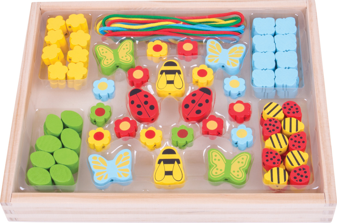 Možnosti jsou nekonečné s touto krásnou kolekcí barevných dřevěných korálků a tkaniček na téma zahrada. Začínající klenotníci mohou ukázat svůj talent, když spojují každý barevný kousek a vytvářejí své vlastní jedinečné náhrdelníky a náramky. Kreativita vzkvétá. Jakmile hrací doba vyprší, můžete všechny dílky uložit do dřevěné krabice. Skvělý způsob, jak podpořit kreativitu a představivost.