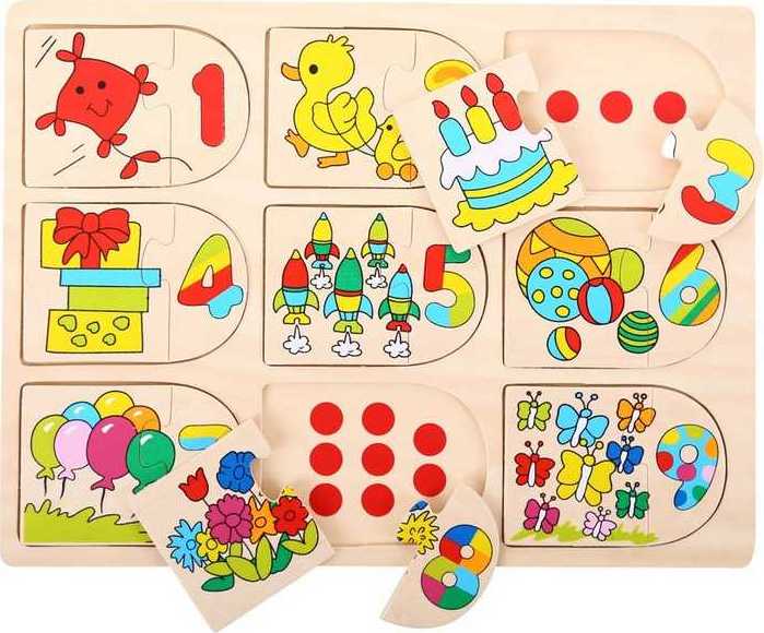 Vaši malí zvědavci budou určitě milovat tohle malé, zajímavé a chytré puzzle. Nejen, že je bude bavit třídit kousky do správných míst, ale mohou vkládat jen samotné obrázky a k nim pak přiřadit ta správna čísla. Každý kousek dřevěné skládačky je dimenzovaný tak, aby usnadnil zvedání, uchopení v malé dětské ručičce. Puzzle jsou potištěny obrázky nebo barvami, které napomáhají procesu učení a dodávají vzdělávací hodnotu. Skvělý způsob, jak rozvíjet obratnost, rozpoznávání tvarů, koncentraci a počítání již od útlého věku.