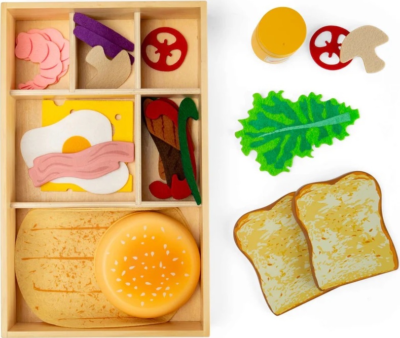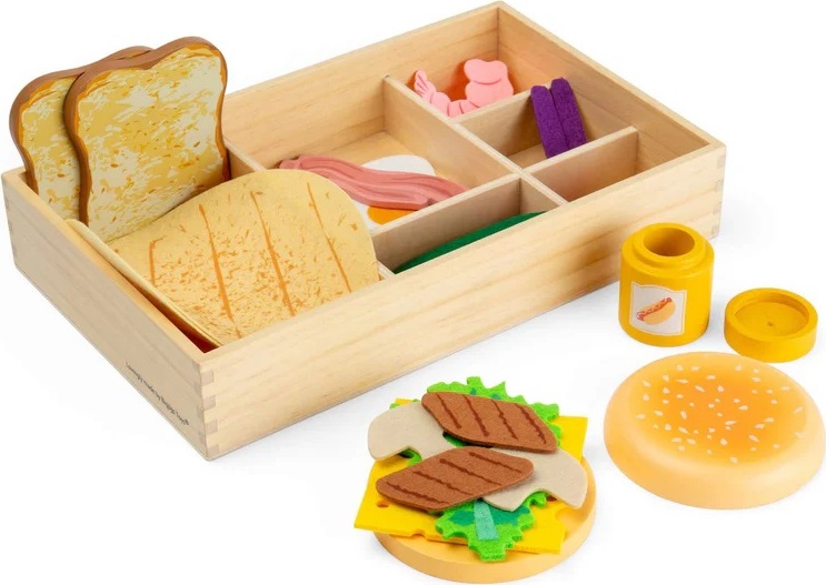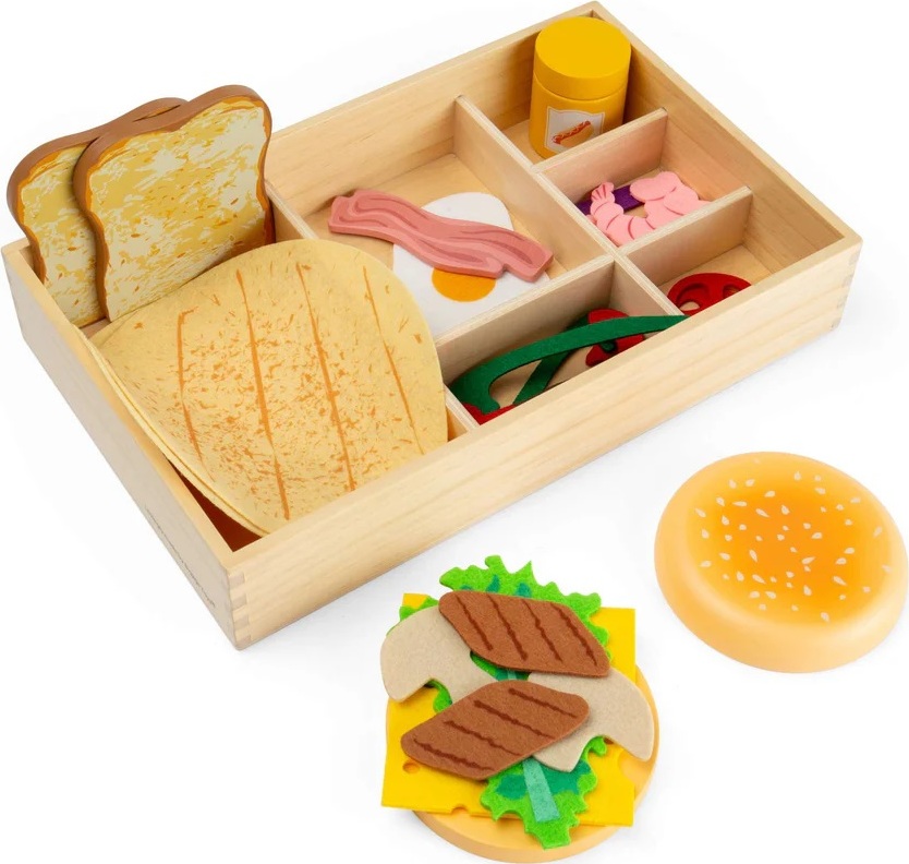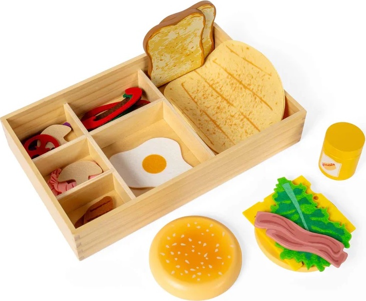 Tato rozsáhlá sada dřevěných a plstěných potravin přináší dětem zábavný svět lahůdek a hraní na obchod nebo kavárnu. Děti mohou skládat, kombinovat a „servírovat“ různé dobroty, vytvářet vlastní příběhy a rozvíjet svou fantazii při hře na prodavače nebo kuchaře. Sada je navržena tak, aby dobře padla do malých dětských rukou, a manipulace s jednotlivými díly podporuje rozvoj jemné motoriky. Společná hra zároveň přirozeně rozvíjí sociální dovednosti a komunikaci. Bohatá kolekce obsahuje kombinaci dřevěných i měkkých plstěných prvků a je uložena v praktické dřevěné přepravce. Součástí je také doplněk v podobě hořčice s otevíracím víčkem, který hře dodává další realistický prvek. Díky kvalitnímu zpracování ze dřeva s certifikací FSC® jde o odolnou a bezpečnou hračku vhodnou pro malé děti, které objevují svět jídla a každodenních situací.