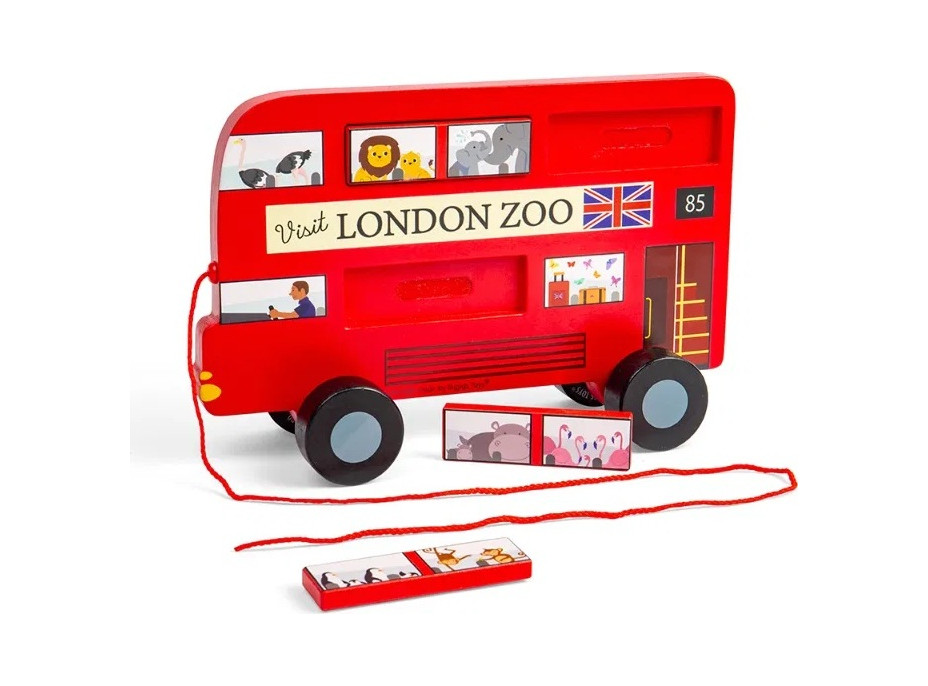Podpořte Vaše dítě při jeho prvních krůčcích tahací hračkou na provázku! Jedná se o klasický červený patrový autobus přepravující cestující po Londýně, jen s tím rozdílem, že tento jede do londýnské zoo a jeho pasažéři jsou zvířátka! Autobus má 6 odnímatelných oken, takže si děti mohou určovat, jak budou cestující v autobuse sedět. Hračka je ideální pro nejmenší děti, které se učí chodit, stane se jejich společníkem při jejich prvním krůčcích. Manipulace a vkládání odnímatelných oken také rozvíjí jemnou motoriku a koordinaci ruka-oko. Tato ekologická dřevěná tahací hračka je vyrobena z prvotřídního a udržitelného dřeva s certifikací FSC® a nabarvena netoxickými barvami a laky. Splňuje aktuální evropské bezpečnostní normy.