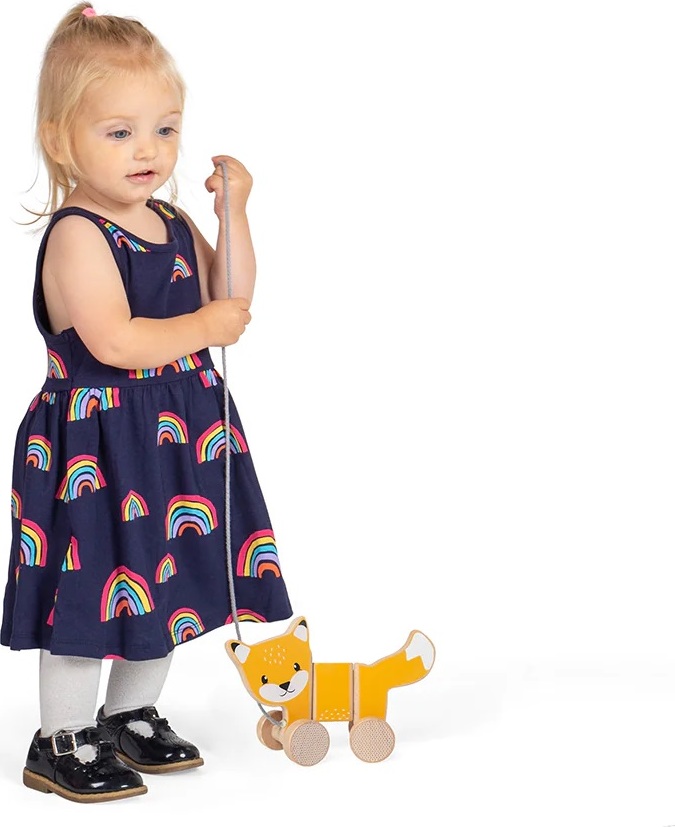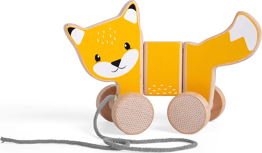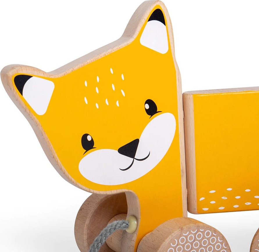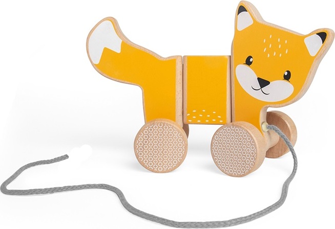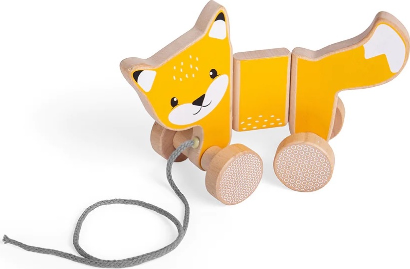 Podpořte obratnost a pohyblivost svého dítěte pomocí tahací hračky. Tato krásná tahací liška v oranžové barvě má milý obličej a je připravena vydat se za dobrodružstvím nebo na procházku. Dřevěná liška je vyrobena z udržitelně těženého dřeva s certifikátem FSC a dekorována barvami a laky bezpečnými pro děti. Čtyři kola mají zábavný geometrický design a hladce jezdí po rovném povrchu, tělo lišky má pohyblivé klouby, takže se snadno mění směr. Šedý tahací provázek je bezpečný a příjemný na dotek v ruce dítěte.