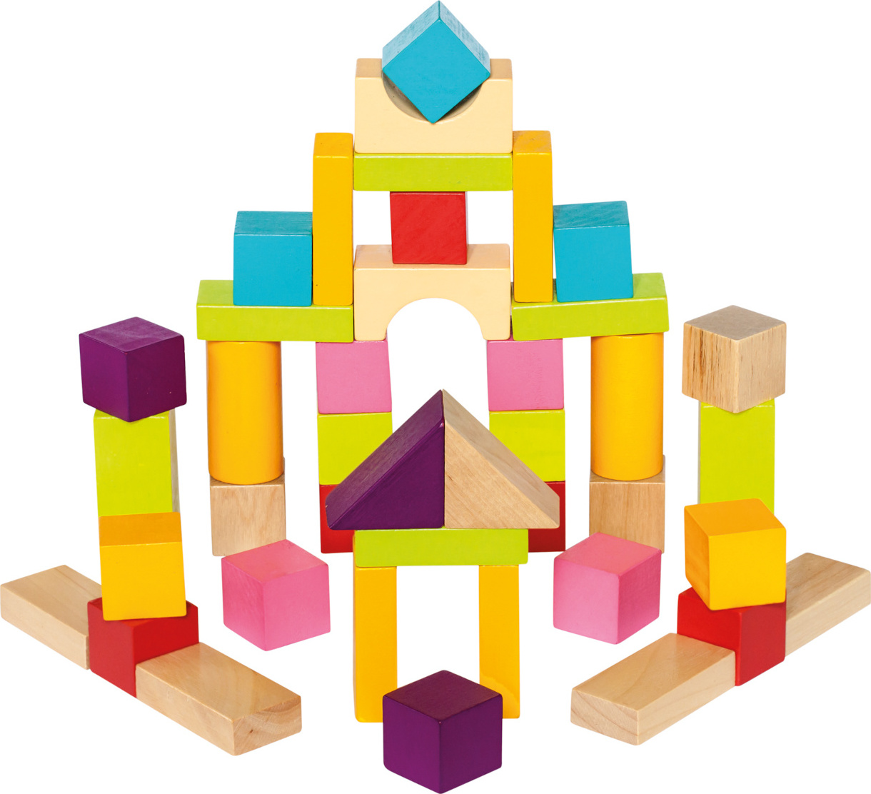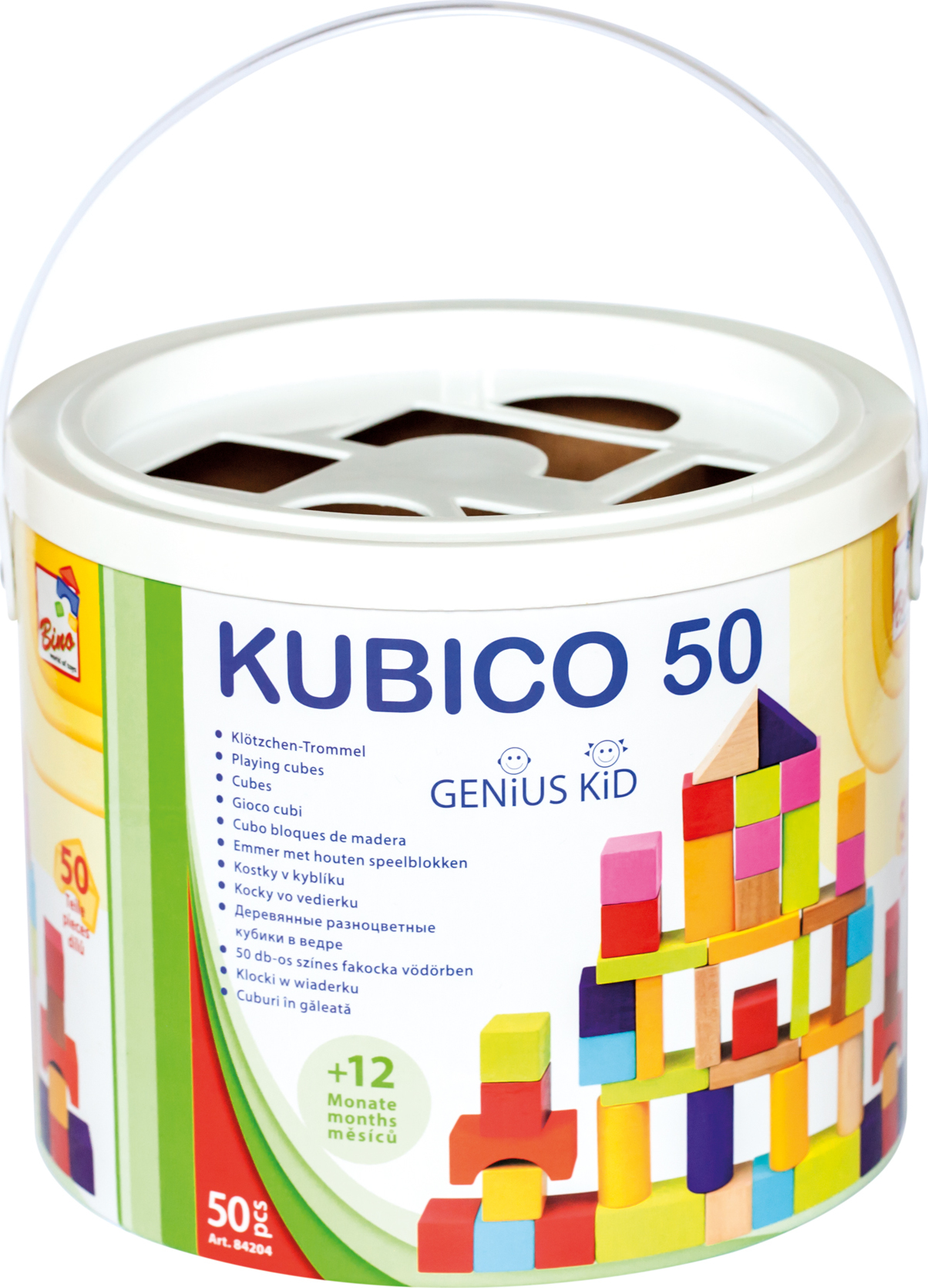 Kostky jasných atraktivních barev a různých tvarů v praktickém kyblíku z kartonu. Víko kyblíku promění balení v hravou vkládačku, může tak dále rozvíjet rozpoznávání tvarů a jemnou motoriku.