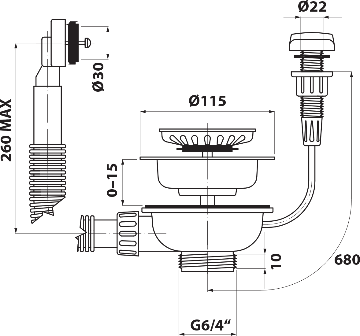 Bruckner Dřezová výpust 6/4", s přepadem a ovládáním, nerez 155.122.1