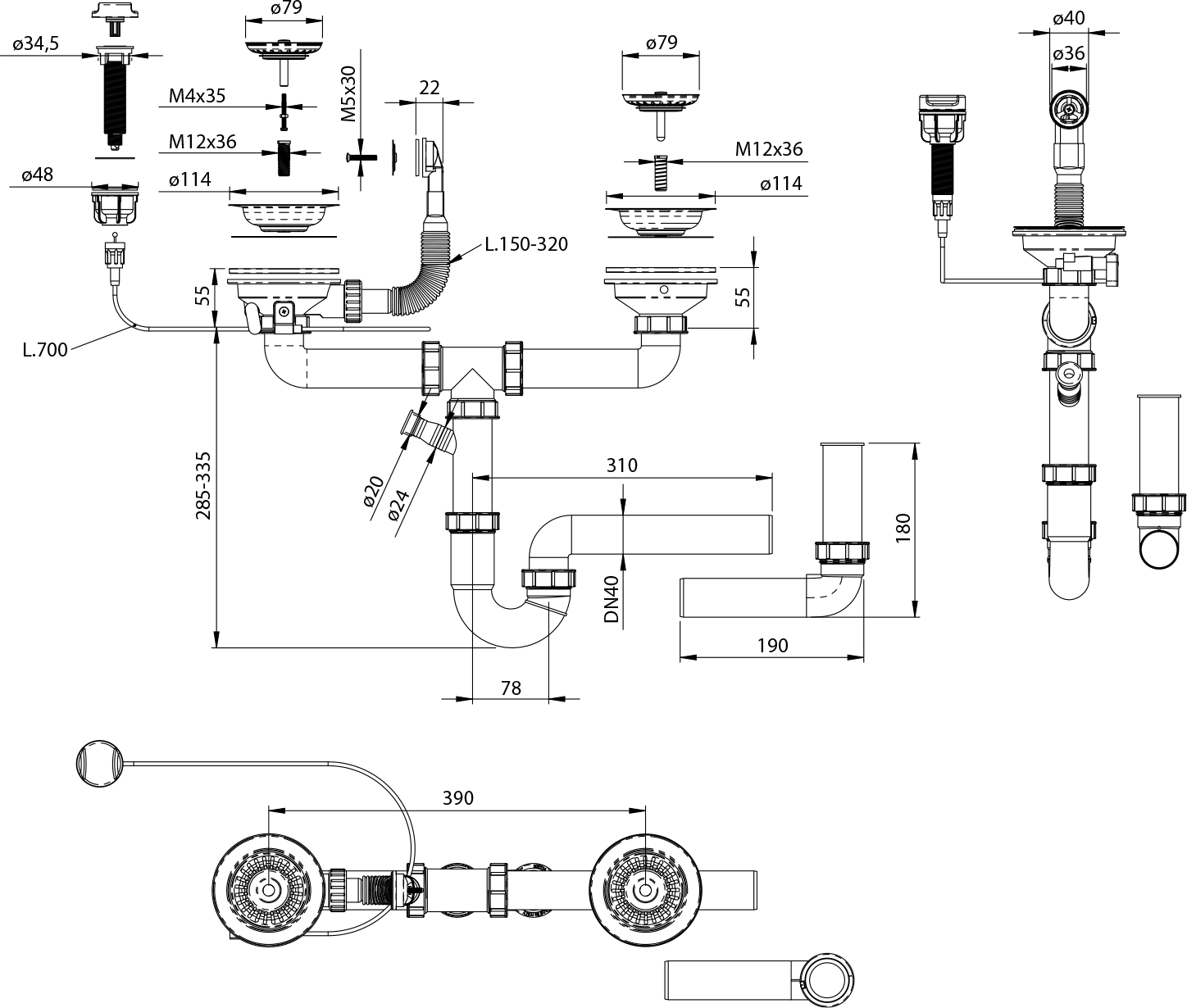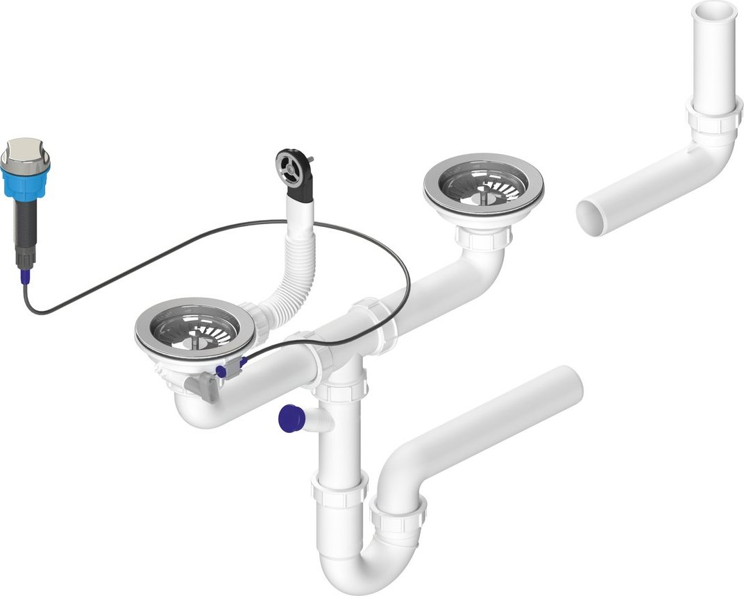 Bruckner Dřezový sifon s přepadem, ovládáním a odbočkou, 6/4", pro dvojdřez, včetně pilety, DN40, bílá 155.129.0