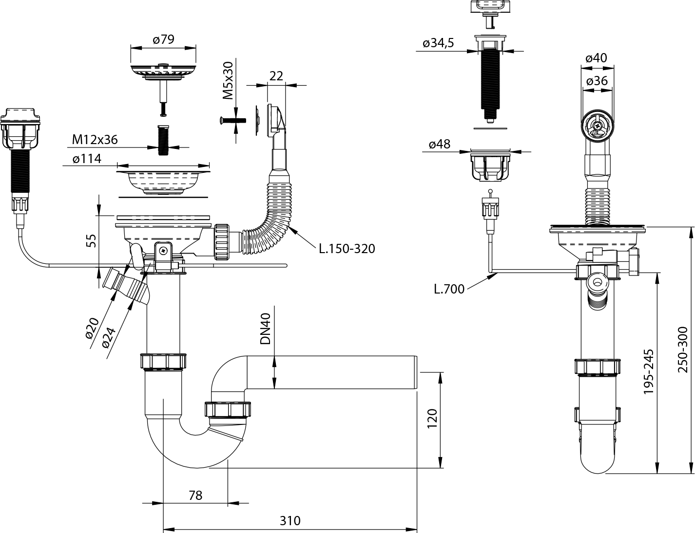 Bruckner Dřezový sifon s přepadem, ovládáním a odbočkou, 6/4", včetně pilety, DN40, bílá 155.128.0